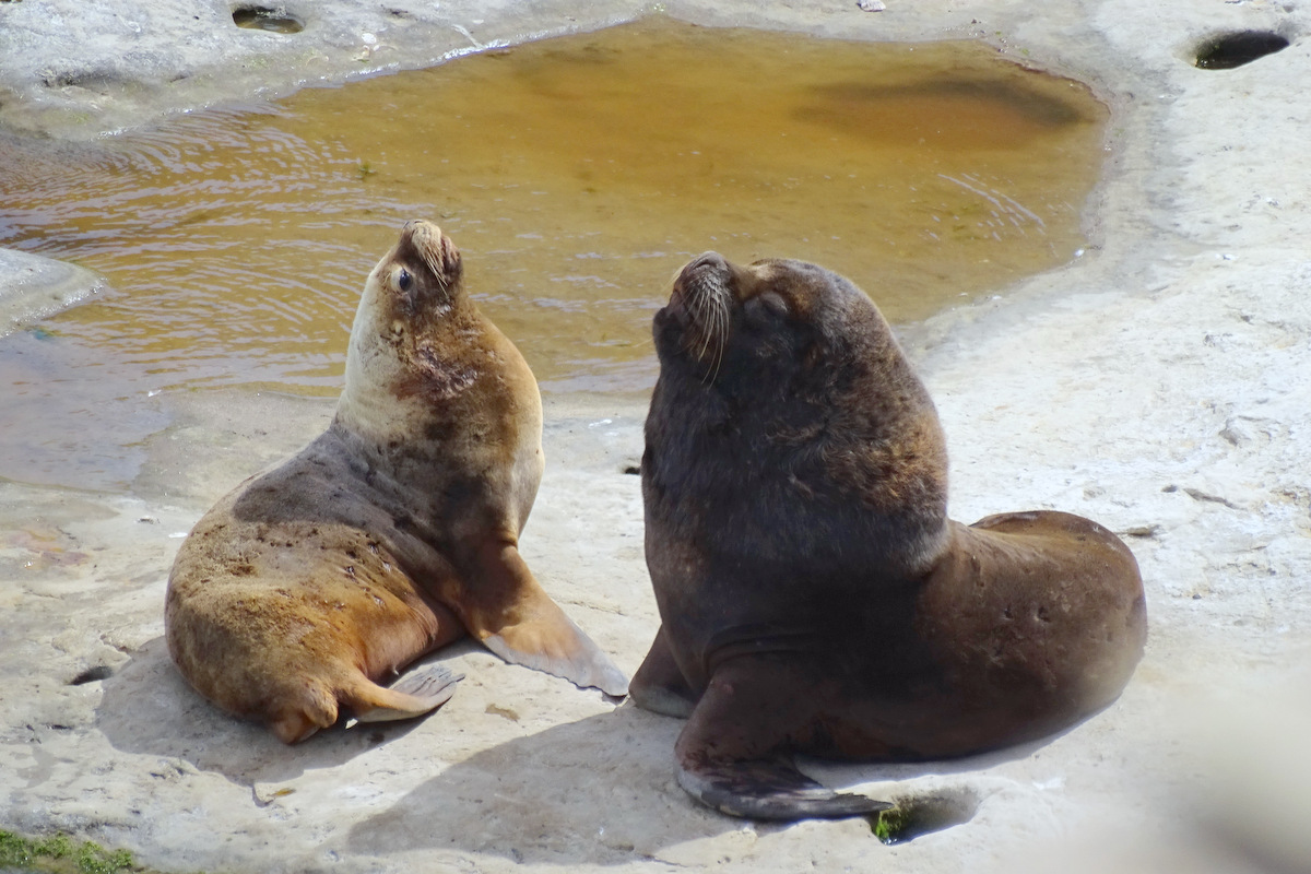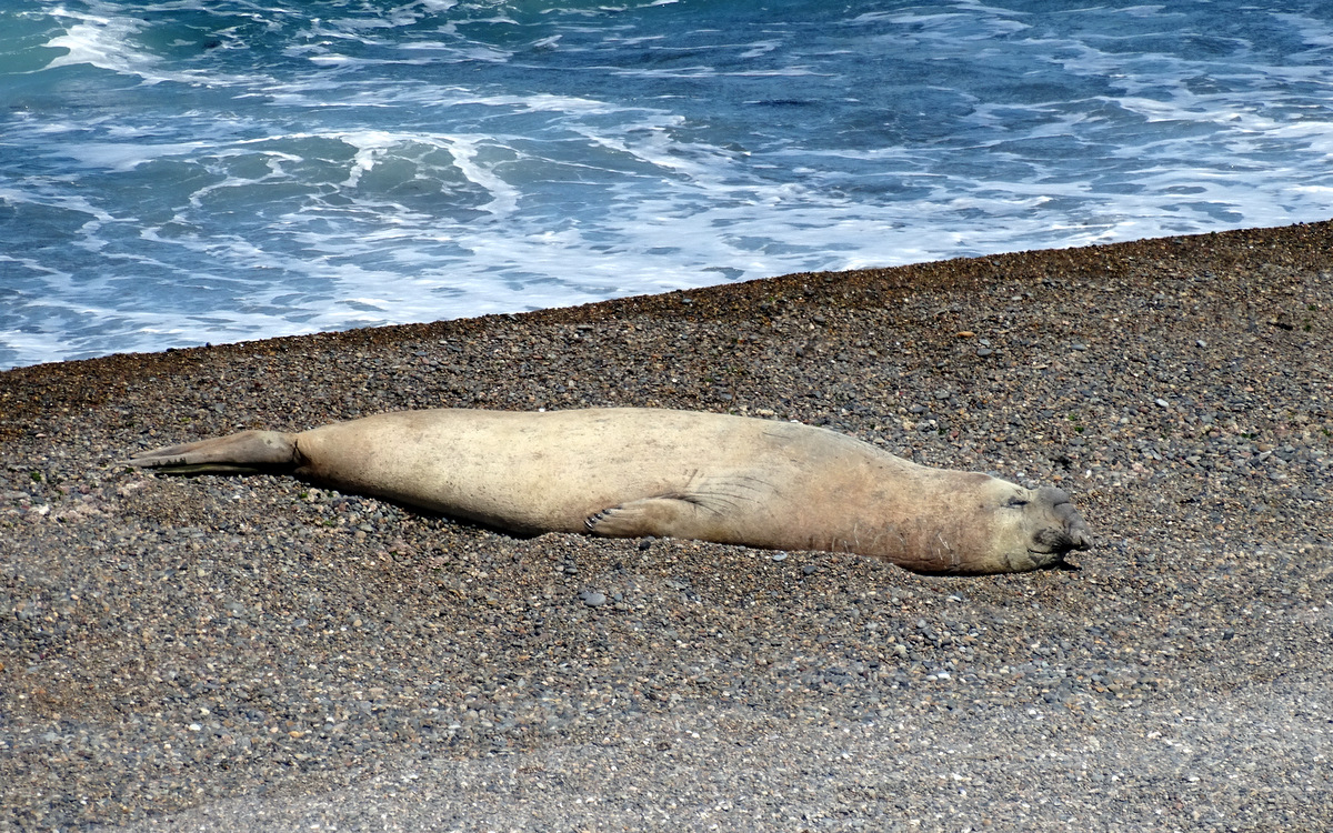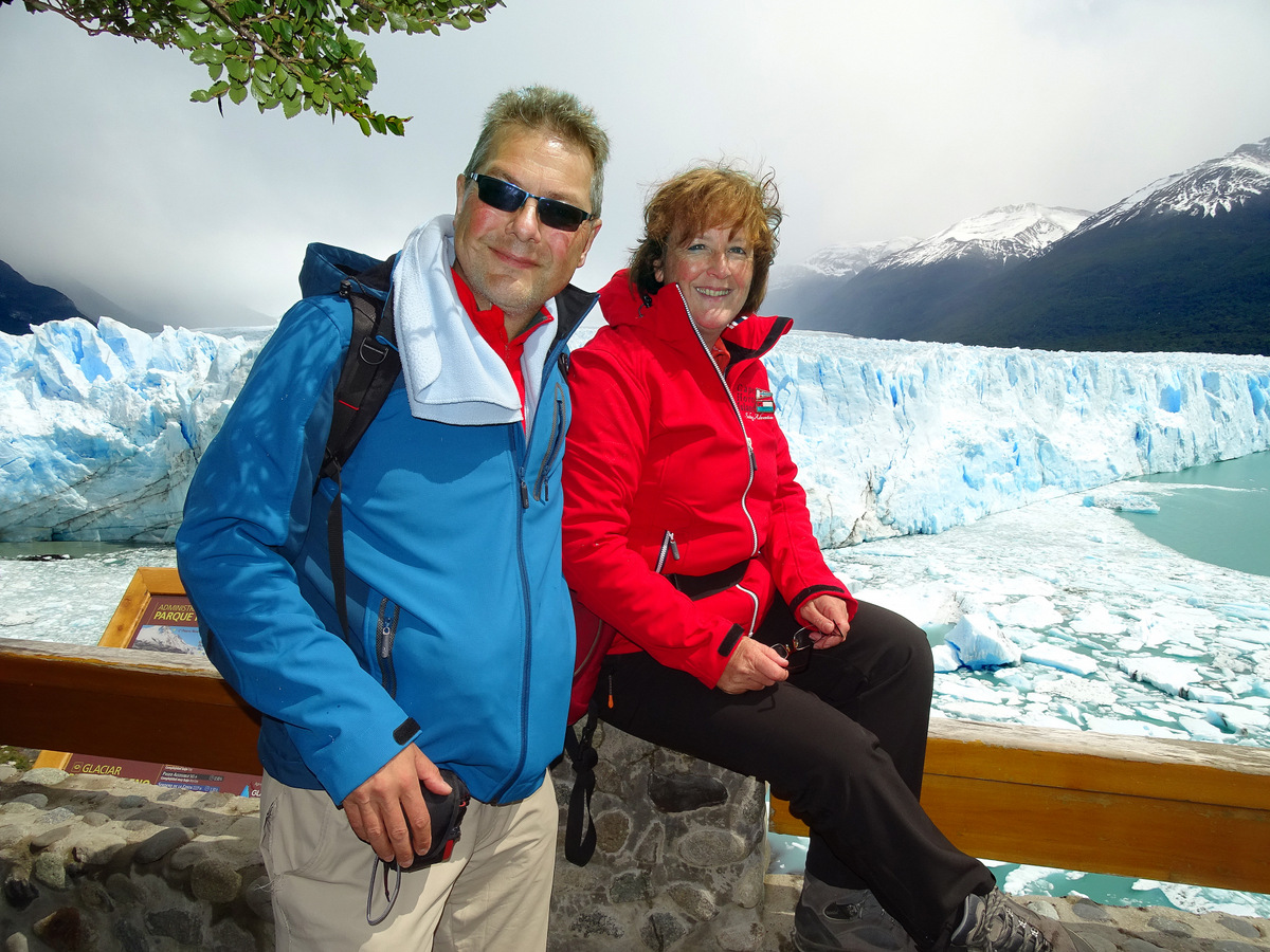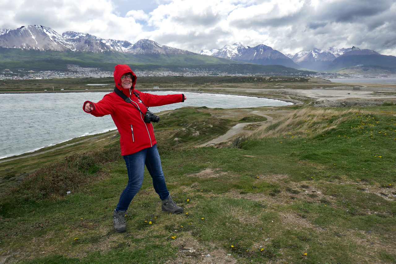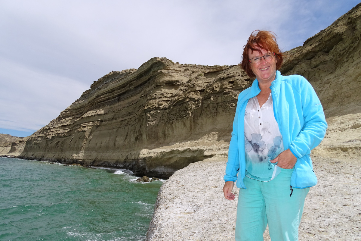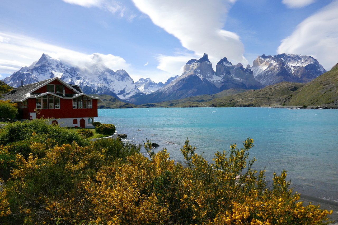 De uitzichten zijn adembenemend, wat een natuurschoon!!! Even verderop stappen we uit en lopen we naar een waterval (Salto Grande) waar met groot geweld het turkooise blauwe water van Lago Nordenskjold in het lager gelegen Lago Pehoe stort. We dalen af naar het met prachtig bloeiende gele bremstruiken omzoomde blauwe Lago Pehoe. Prachtig, leve de lente! We lunchen in een restaurant aan Lago Pehoe met over het meer een uitzicht op de Los Cuernos (de hoorns), een aantal pieken, die vanwege de verschillende gesteenten, in het zonlicht prachtige kleuren laten zien. De bovenkant van de pieken is sediment van een prehistorische zee met een basaltlaag eronder op een fundament van graniet. Ik kan me niet veel plaatsen voorstellen waar je een mooier uitzicht hebt tijdens de lunch…