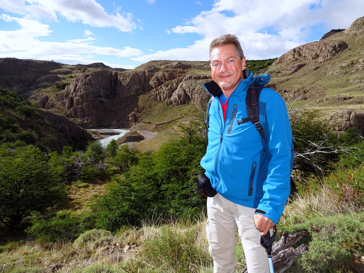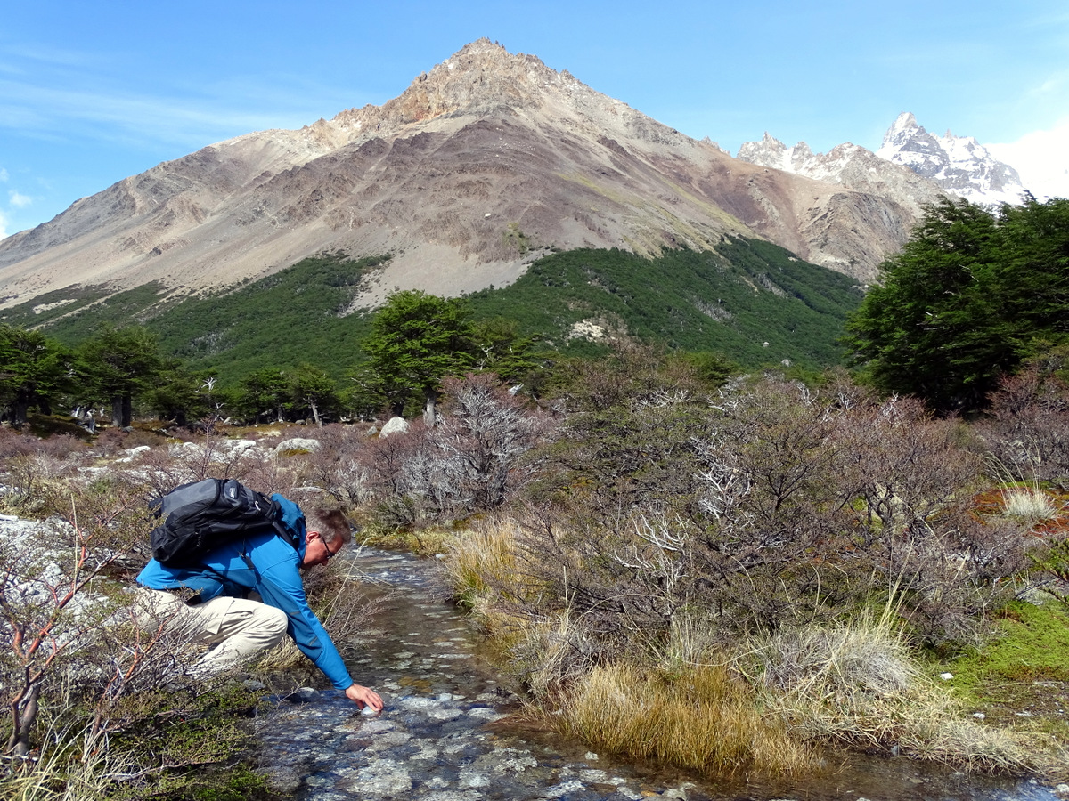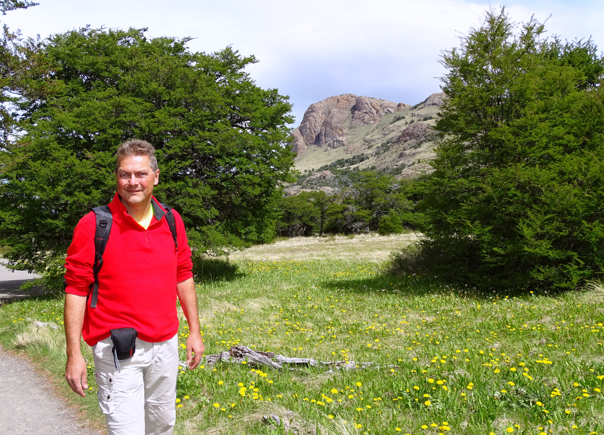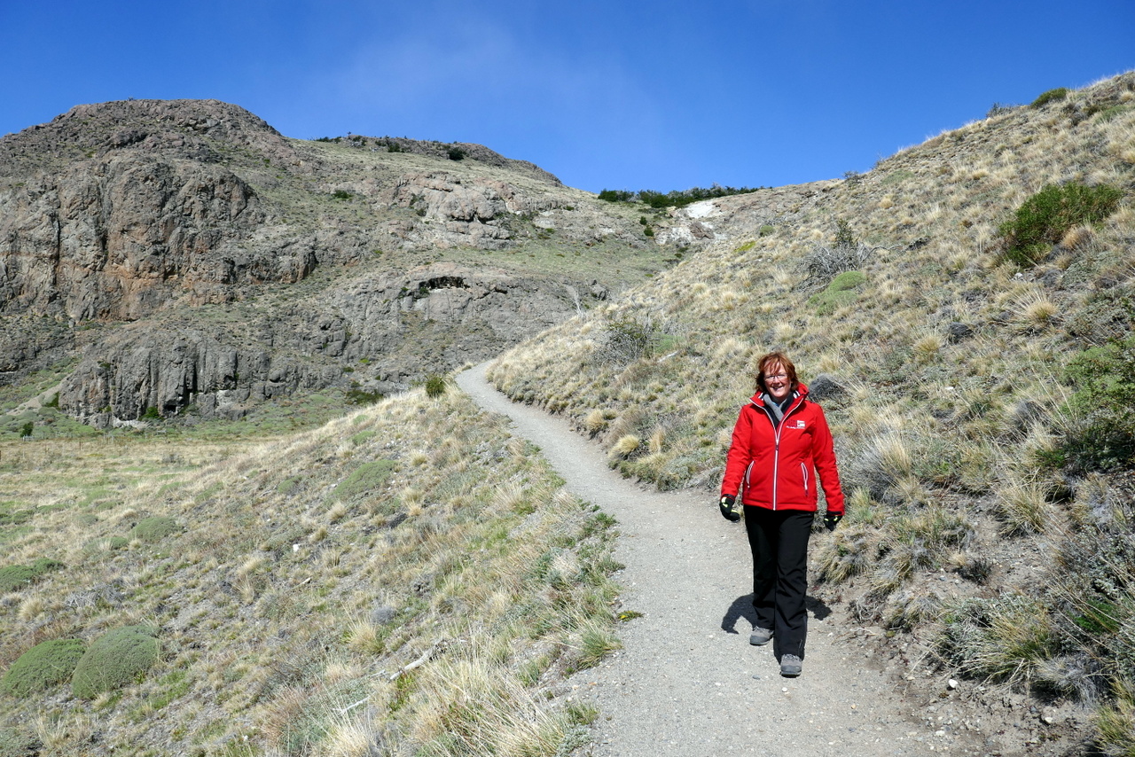 Na bestudering van het weer (voor zover dat hier in de bergen mogelijk is), besluiten we onze mooiste en zwaarste tocht voor de tweede volle dag te bewaren, omdat die beloofd veel zonniger te worden, en eerst de omgeving van de refugio ter verkennen en een deel van de Senderos de Los Cuernos (deel van de wereldberoemde W-trek van dit park, een vijfdaagse trek langs de pieken van Torres del Paine) te lopen. Het weer is prachtig en er staat zowaar bijna geen wind! We lopen over een glooiend terrein langs de bergen van Las Torres. Er groeien voornamelijk kleinere struiken, maar het oogt hier veel groener dan in bijvoorbeeld El Calafate aan de andere kant van de grens.