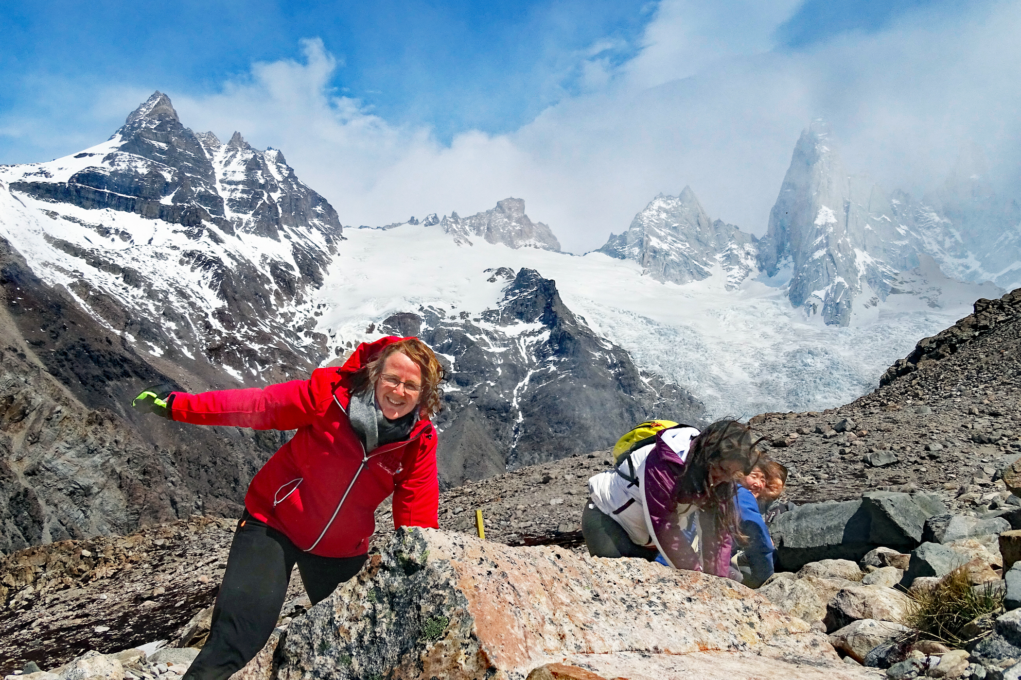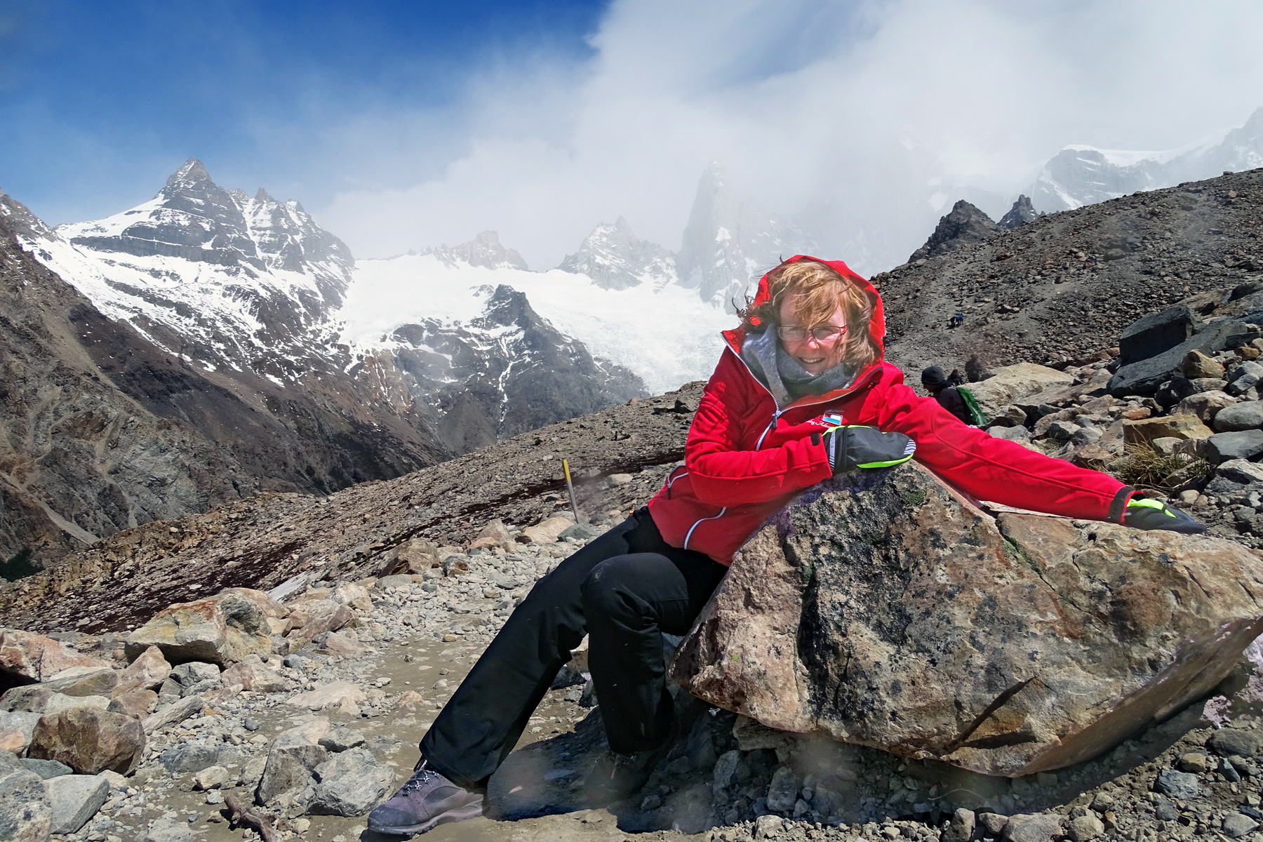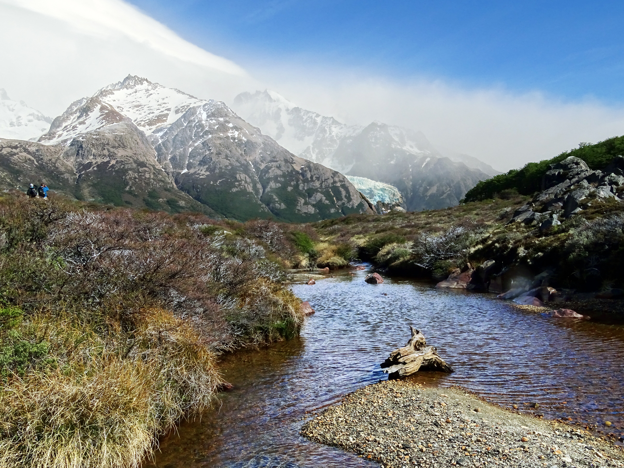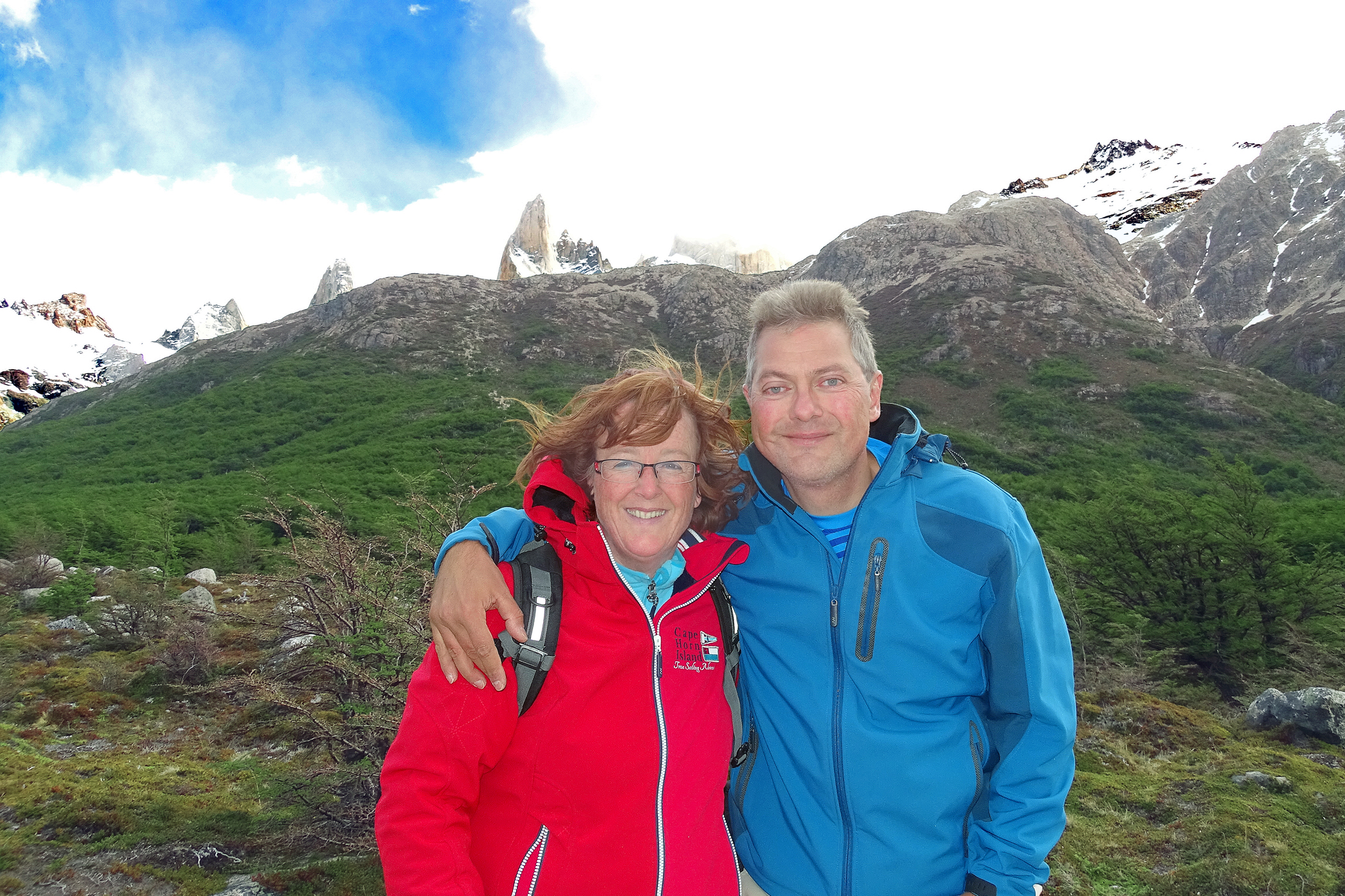 Na bestudering van het weer (voor zover dat hier in de bergen mogelijk is), besluiten we onze mooiste en zwaarste tocht voor de tweede volle dag te bewaren, omdat die beloofd veel zonniger te worden, en eerst de omgeving van de refugio ter verkennen en een deel van de Senderos de Los Cuernos (deel van de wereldberoemde W-trek van dit park, een vijfdaagse trek langs de pieken van Torres del Paine) te lopen. Het weer is prachtig en er staat zowaar bijna geen wind! We lopen over een glooiend terrein langs de bergen van Las Torres. Er groeien voornamelijk kleinere struiken, maar het oogt hier veel groener dan in bijvoorbeeld El Calafate aan de andere kant van de grens.