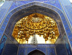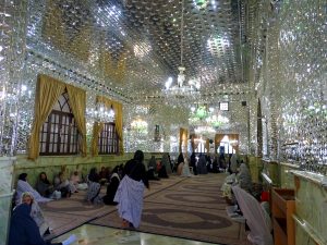 Het mausoleum van Fatima heeft gouden koepels en sierlijke minaretten. De ruimte met de schrijn zou ook zo’n spiegelpaleis moeten zijn, maar helaas mogen we ook hier niet naar binnen. Sowieso heeft onze gids hier nogal haast. Zo anders dan in Shah-e-Cheragh waar we ruim een uur begeleidt werden. Maar het hele complex is met zijn gouden koepels en prachtig gekleurde minaretten overweldigend mooi. Wat een rijkdom straalt het uit.