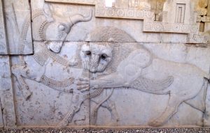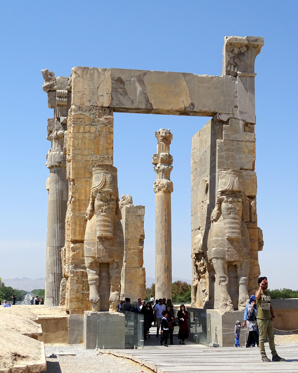Na zo’n 100 kleine treetjes op de monumentale entreetrap ( zodat 2000 jaar geleden de Meden en de Perzen die hier op audiëntie kwamen bij de koning, met hun kostbare zware gewaden op een waardige manier naar boven konden schrijden) bereiken we “de poort der naties” met aan weerszijden reusachtige gevleugelde stieren met mensenhoofden. Een indrukwekkende entree.