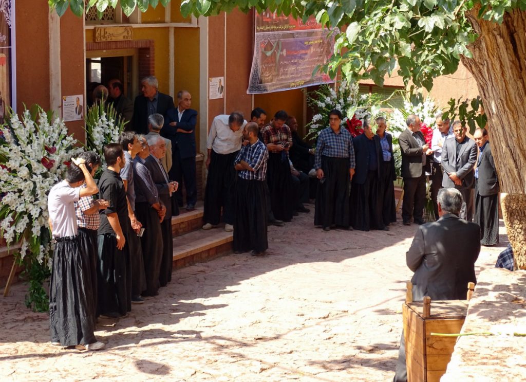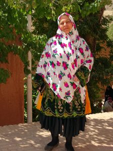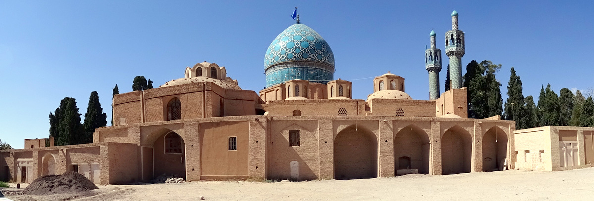 We rijden door naar Mahen. Daar brengen we een bezoek aan het mausoleum van Shah Ne’matollah, een beroemde Soefi, dichter en grondlegger van de orde van derwisjen. Een prachtige blauwe koepel prijkt boven het gebouw uit. Bij het naar binnen gaan wordt Jacqueline in haar blauwwitte outfit meteen omsingeld door een twintigtal dames in zwarte chador’s met bijbehorende kinderen. Na de bijna verplichte fotoshoot en 80 selfies van 15 minuten gaan we via een binnenplaats met vijver het gebouw binnen. Mooie tapijten en prachtige koningsblauwe en flesgroene kroonluchters sieren de vloeren en plafonds. In een nis in een hoek van het gebouw zien we enkele van de unieke kalligrafische ornamenten, waar het mausoleum ook bekend om staat.