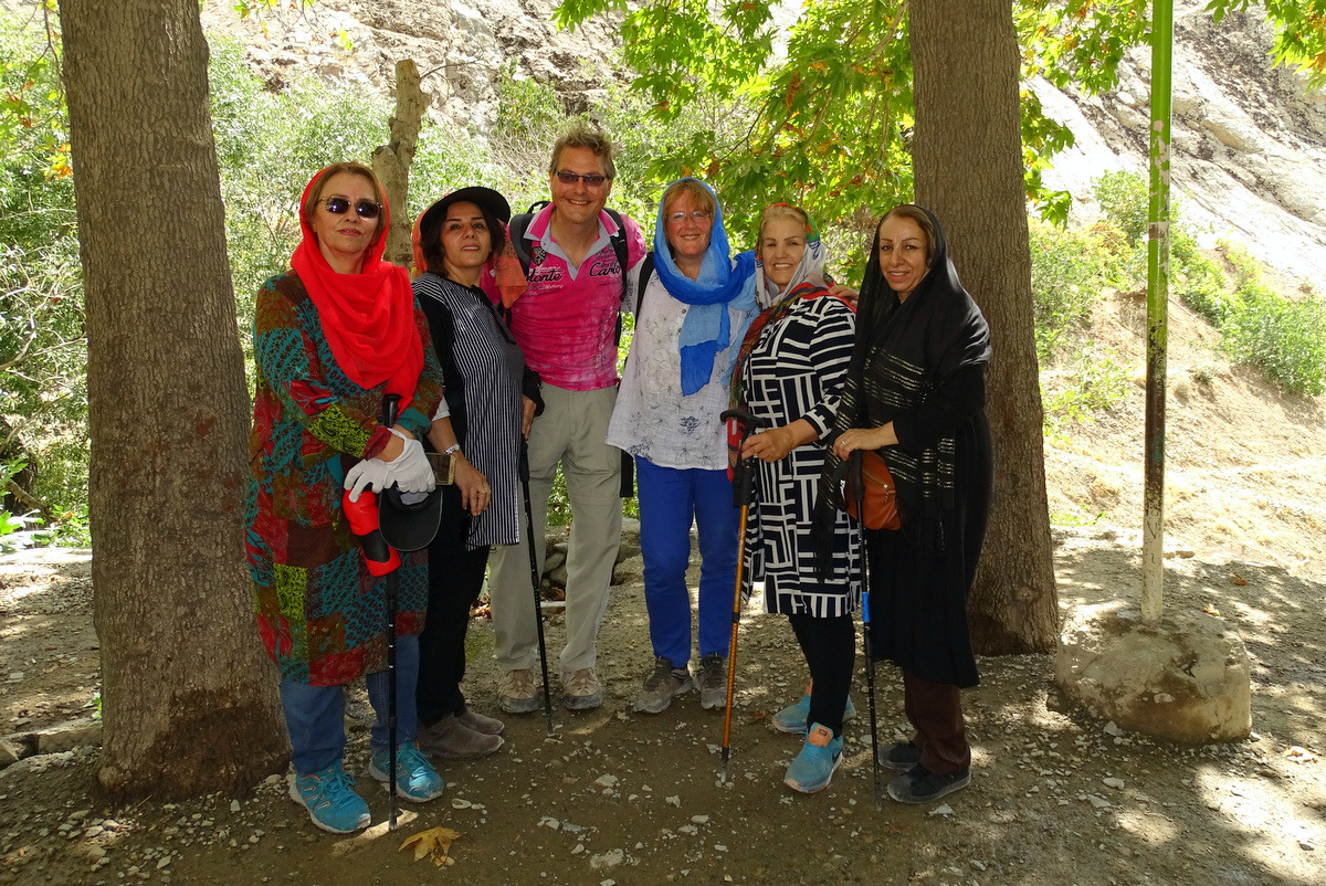 De temperatuur is een stuk aangenamer dan beneden in Teheran en regelmatig lopen we beschut onder een bladerdek.