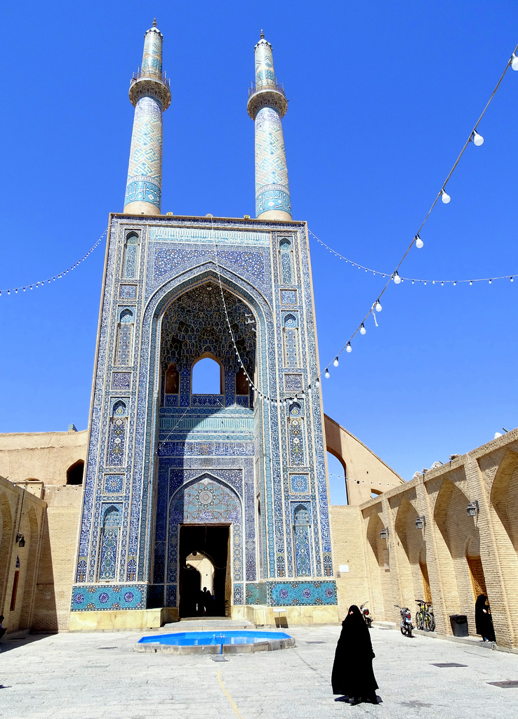 In de zoektocht naar de ingang van onze volgende bestemming komen we bij een mooie binnenplaats. Alweer een moskee? We lopen de binnenplaats op en Jacqueline wordt meteen achtervolgt door een man met een groene plumeau. Wordt nu voor de eerste keer Jacqueline terecht gewezen op het verkeerd dragen van haar chador of een foutje in haar kleding? Nee! Het blijkt het sleutelmannetje te zijn die special voor ons het oudste gedeelte van deze moskee wil open maken. Het plein blijkt te behoren aan de Atigh Jame moskee.