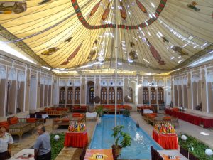 Het oude centrum van Yazd is een van de oudste centrums ter wereld. Wij zitten in een hotel in dat oude centrum en recht tegenover ons hotel kunnen we al de oude overdekte bazaar inlopen. Het hotel is een voormalig historisch koopmanshuis. De kamers liggen rondom een centrale met tentdoek overdekte patiotuin. Wij krijgen een kamer die via een steile trap te bereiken is. We komen dan eerst in een halletje met twee fauteuils en de deur naar de badkamer. Rechtdoor komen we in de slaapkamer met drie bedden met uitzicht op die patiotuin. Tjonge, een heel sfeervolle kamer met muurschilderingen, antieke voorwerpen ter decoratie en mooie glas in loodramen.