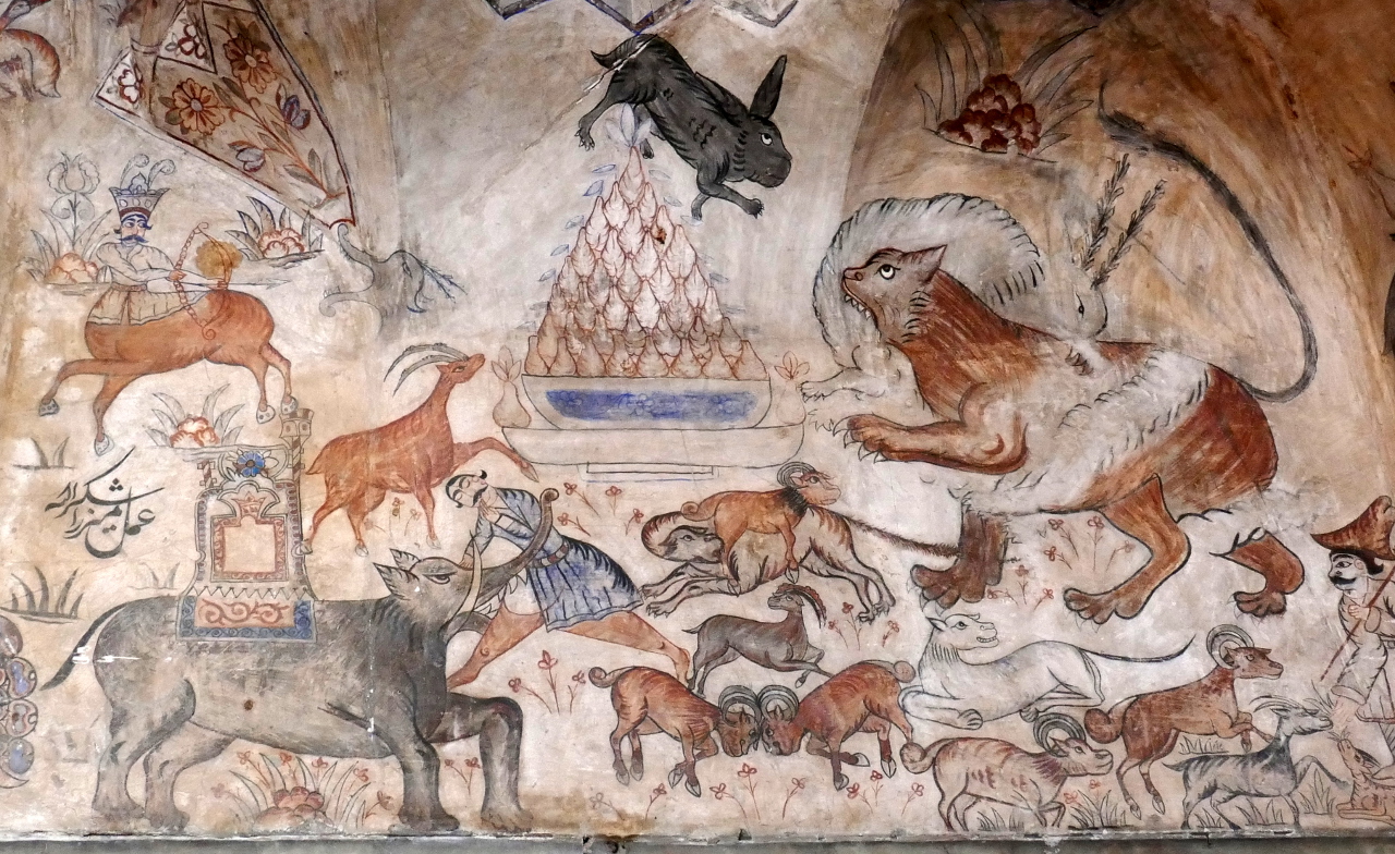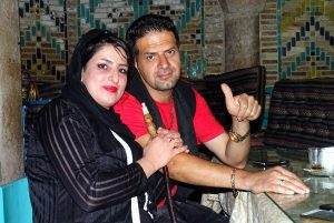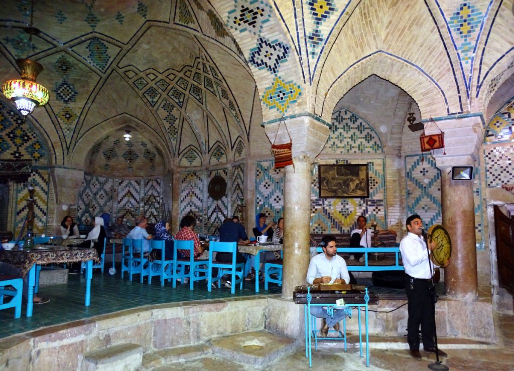 Deze prachtige 400 jaar oude fresco’s van wilde dieren zijn heel goed bewaard gebleven! In de bazaar bevindt zich ook het Vakil theehuis en restaurant, dat gevestigd is in een voormalig badhuis. Er is live muziek van een zanger met een Sintar-speler (een soort 4-snarig liggend instrument) als begeleider. We nemen plaats aan een tafel en genieten van de sfeer en de mooie ruimte. Aan de andere kant van de tafel zit een vrouw van een stel waterpijp te roken. Zoals overal in Iran volgt er ongeveer meteen contact en de man blijkt een goochelaar te zijn. Hij vertoont meteen enkele van zijn kunstjes en we moeten natuurlijk ook meteen met hun op de foto.
