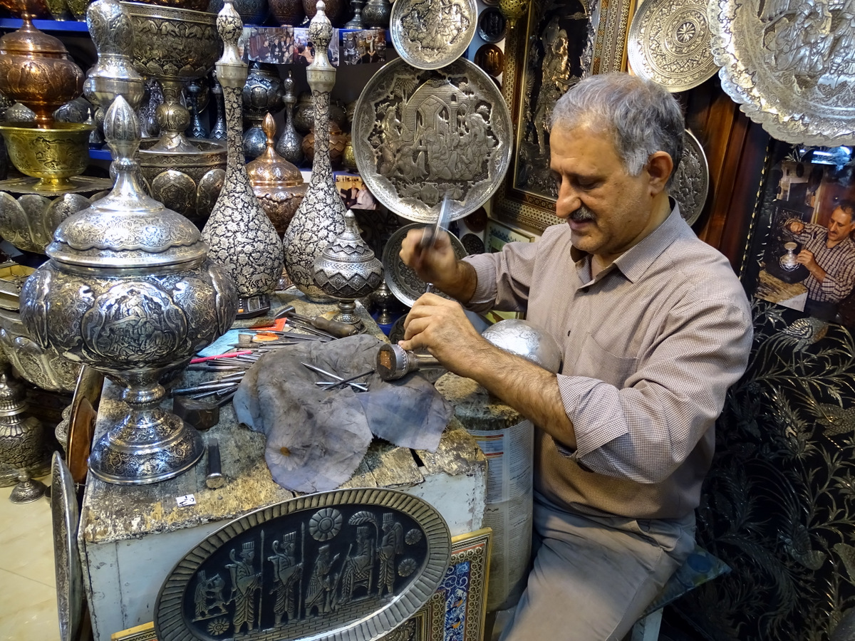 De Qaisarieh Bazaar aan het Naqsh-e Jahan plein was ooit één van de grootste en meest luxe winkelcentrums. Vroeger was de bazaar het ware centrum voor stofjes en kwamen handelaars van ver gelegen plekken naar Isfahan om hier te handelen. Tegenwoordig is deze bazaar gespecialiseerd in diverse ambachten in Isfahan. Wij hebben een praatje gemaakt met een koperslager die zijn ontzettend verfijnde ambachtskunst liet zien. Hij was door Unesco uitgeroepen tot beste koperslager en heeft ook handelscontacten met bedrijven in Nederland. Trots liet hij foto’s zien en zijn getuigschrift. Net als bij de verloren was methode bij brons was hij nu bezig met het koperslaan rondom een wassen vaasmodel. Als hij klaar is met zijn werk wordt de was eruit gesmolten en houd je de holle vaas over. De toegang naar de Bazaar is een majestueuze poort die is beschilderd en versierd met mozaïektegeltjes.