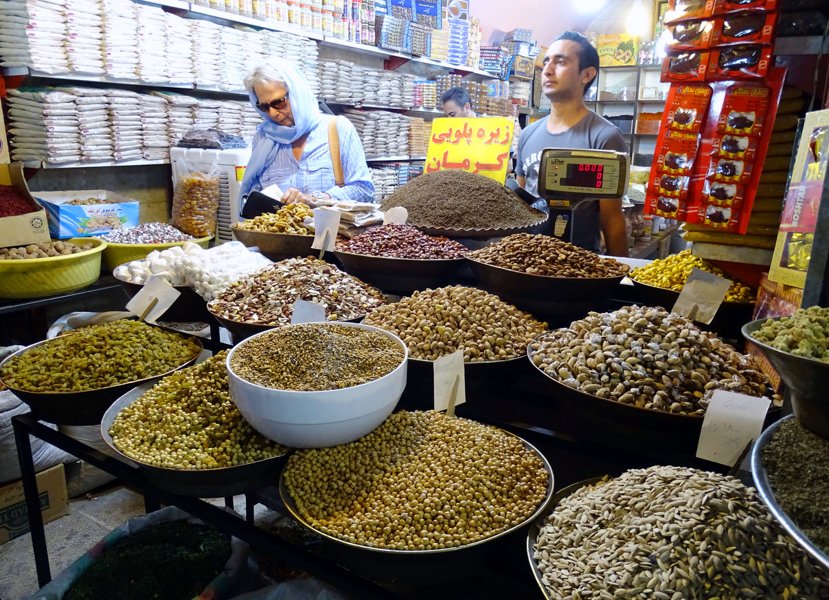 Ondertussen zijn we aardig verhit geraakt en zijn blij dat we via de koelere overdekte bazaar terug naar het hotel kunnen lopen. ’s Middags is alles gesloten, een soort siësta, maar vanaf ca. 16.00 komt er weer bedrijvigheid en ’s avonds is het er een drukte van belang. We passeren oogverblindende spiegelwinkels en net zo schitterende goudwinkels waar bijna alles bezet is met glimmende stenen. Iraniërs houden van blingbling!