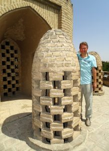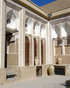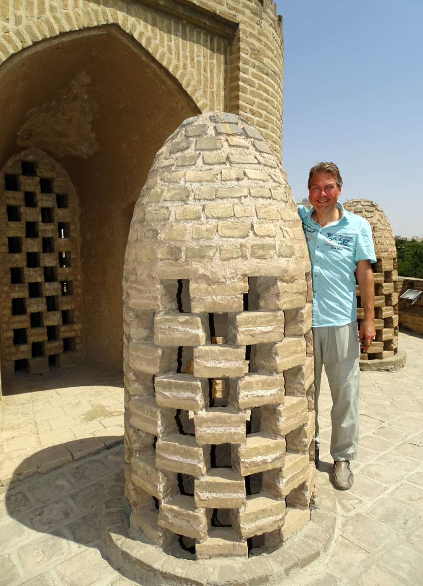 Hoewel omringd door twee woestijnen, beschikt Yazd toch over voldoende water. Het water wordt via ondergronds gegraven kanalen (qanats) uit het vijftig kilometer verderop gelegen gebergte naar de stad getransporteerd leren we in het watermuseum. Die gangetjes waren hooguit 60 cm breed en wilden tijdens de bouw nog wel eens instorten. Dit aardige museum zit ook in een voormalig mooi gedecoreerd koopmanshuis en heeft natuurlijk ook een binnentuin.