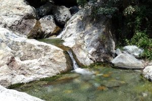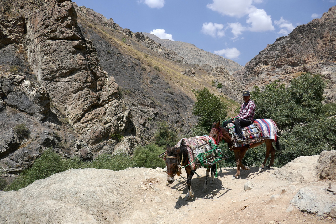 Aangekomen in Darakeh nemen we afscheid van Amir. Darakeh is een wijk in het noord-westen van Teheran. Op donderdag en vrijdag trekken de mensen vanuit Teheran hier massaal heen om te wandelen. Van hieruit kun je verder de bergen in het noorden van Teheran inlopen langs een vallei die doorsneden wordt door een riviertje. Op dit moment staat er aan het einde van de zomer nauwelijks water in de rivier. We lopen langs de rivier omhoog en passeren een veelvoud aan thee-huizen. Naarmate we hoger de berg oplopen wordt het terrein langzaam wat ruwer en komen we langs steeds mooiere rotsformaties. Ook zien we regelmatig behoorlijk groene stroken met bomen en struiken. Regelmatig komen er pakezels de berg omlaag en omhoog die de verschillende thee-huizen bevoorraden.