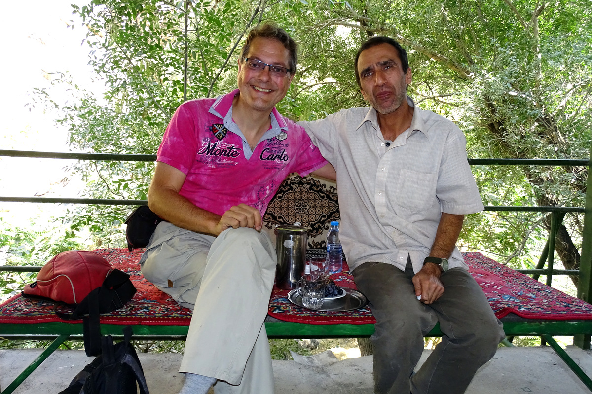 Wat is het heerlijk om hier net buiten deze miljoenenstad te wandelen zonder al dat getoeter en de uitlaatgassen van auto’s om je heen! Na zo’n 2.5 uur op ons gemak te hebben gelopen komen we bij een bordje waarop staat dat we ons op 1990 meter hoogte bevinden. Hier besluiten we om terug te lopen. Iets verder terug op het pad gaan we bij een oude put zitten om van onze lunch te genieten. Dat kan natuurlijk niet, want de eigenaar van het gesloten thee-huis tegenover vind dat we toch echt wel beter kunnen uitrusten bij hem, en we kunnen natuurlijk niet weigeren. We krijgen water, thee en druiven aangeboden en praten gezellig in een combinatie van gebaren, Duits en Engels met de eigenaar. De thee is lekker, deze komt uit het noorden van Iran, uit de provincie waar de eigenaar vandaan komt. Trots toont hij ons de verpakking van de thee. We nemen afscheid van onze hartelijke gastheer en lopen terug naar Darakeh.