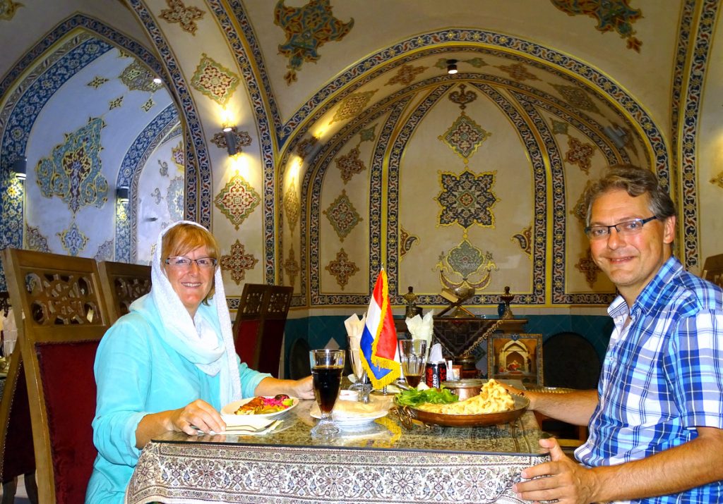 Net om de hoek nemen we onze lunch in het Malek Soltan Jarchi Bashi traditioneel Perzisch restaurant. Het is gevestigd in een oud badhuis uit 1611 dat in de oude stijl is gerestaureerd, gebaseerd op historische foto’s. In die tijd was het het grootste badhuis van Isfahan dat twee mannen en twee vrouwen had. Het restaurant is werkelijk fantastisch mooi en er staan op verschillende plaatsen oude gebruiksvoorwerpen. Jacqueline neemt een Dolomeh chicken kebab en ik neem een Biryani met Biryani bouillon. Mijn gerecht wordt geserveerd in een koperen schaal en bestaat uit een dubbel gevouwen stuk brood met daarin gekruid (in ieder geval saffraan) lamsgehakt met walnoten en ernaast bladeren die naar anijs smaken. Op de schaal staat ook nog een koperen pannetje met daarin brood (en vermoedelijk kaas) gedrenkt in de bouillon. Het smaakt heerlijk! Wat een goed restaurant met een heerlijke ambiance!