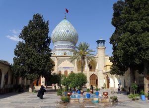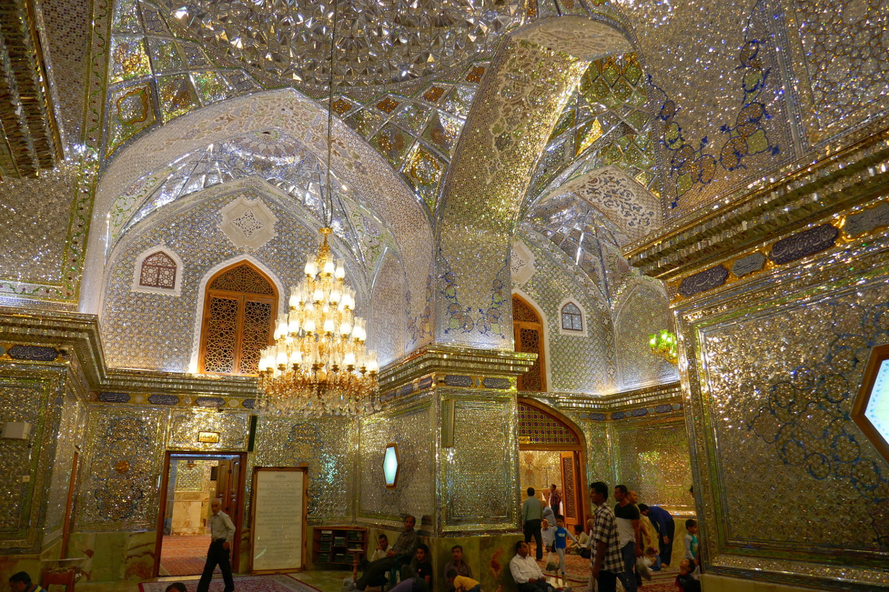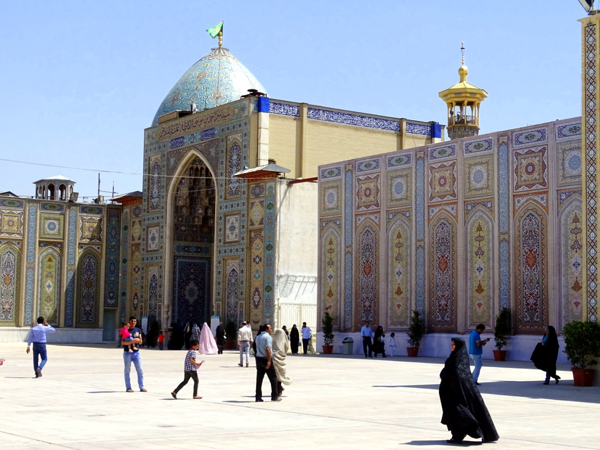 Één van de (en ook onze) hoogtepunten van Shiraz is toch wel de heilige schrijn Shah-e-Cheragh (Koning’s licht). Hier liggen de twee broers Amir Ahmed-Ibn-e-Musa Al-Kazam en Amir Mohammed-Ibn-e-Musa Al-Kazam begraven. Het zijn broers van imam Ali-Ibn-e-Musa Al-Reza, de achtste imam van het sjiisme. Daarmee is dit mausoleum, dat ooit rond 1130 AD gebouwd werd, een belangrijk pelgrimsoord. We krijgen een min-of-meer verplichte gids toegewezen, een uiterst vriendelijke jongen die dit eens per week als vrijwilliger doet. Hij weet veel over dit complex te vertellen. Vanwege de recente aanslag in Teheran is het wel wat meer gedoe om binnen te komen. De eerste binnenplaats waar we komen is net een maand opgesteld voor het publiek.Ze bouwen namelijk nog steeds verder aan het complex. De gebouwen van dit eerste plein zijn een oase van kleur.