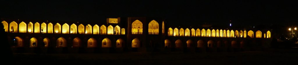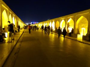 In de avond lopen we naar de rivier om enkele van de elf bruggen van Isfahan te bekijken. De Si-o-se Pol brug (1599 tot 1602), de Joui brug (1665) en de Khajou brug (1660) werden allemaal gebouwd in de tijd van de Safawiden. De eerste en de laatste brug zijn ‘s avonds een favoriete ontmoetingsplek voor de mensen van Isfahan. Op de Khajou brug wordt regelmatig door groepjes mensen gezongen, en dat terwijl dit eigenlijk officieel niet mag. Als wij over de brug slenteren komen we ook enkele groepjes tegen die prachtig zingen. Helaas worden ze even later inderdaad door de politie verjaagd. Even later zien we een groepje weer bij elkaar komen, wellicht dat ze later nog een poging wagen…