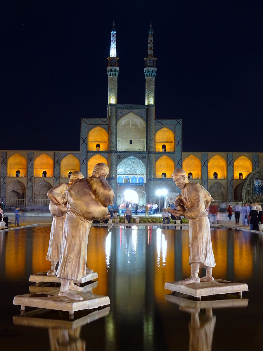 Ons volgende doel is het Amir Chakhmagh plein van waaruit jaarlijks duizenden Sjiitische moslims in optochten de dood van Imam Hossein herdenken. Aan dit plein staat ook het gebouw met dezelfde naam, maar hiervan zijn alleen nog de monumentale façade met driedubbele arcadenrij en twee ranke betegelde minaretten bewaard gebleven. In de vijver ervoor staat de beeldengroep “de reizigers”.