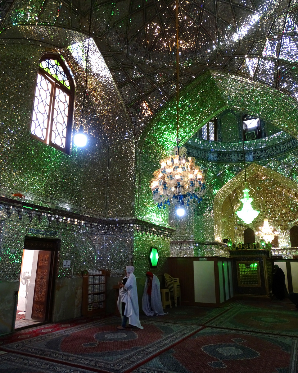 Ik weet niet wat ik zie!!! Duizenden kleine spiegels bedekken het interieur van het paleis. Het summum van bling bling!!! Bijna alles wat ik zie heeft een zilveren of gouden glans, behalve de schrijn met de kist, die is in de voor de islam heilige kleur groen. De mannen wandelen naar de schrijn, raken hem aan en bidden kort alvorens zich een plekje op de vele rode tapijten te zoeken. Ik weet niet hoe ik het allemaal op de foto moet zetten. Schitterend!!! Letterlijk als figuurlijk…
