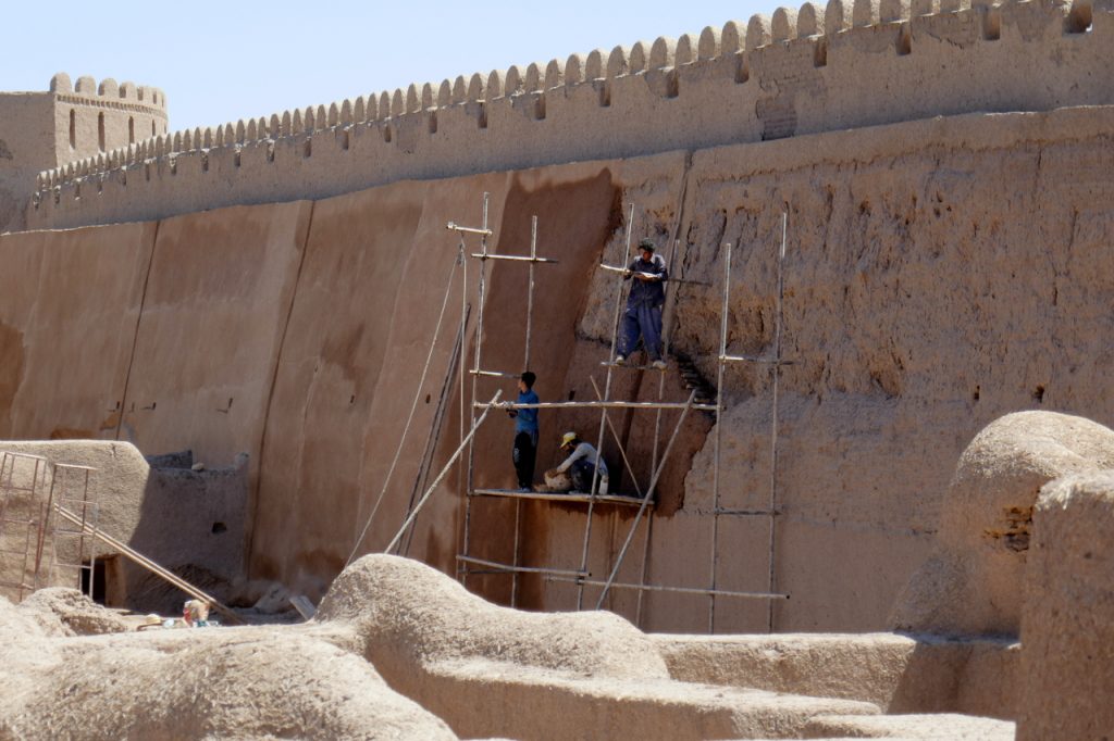 De funderingen dateren uit het pre-islamitische tijdperk en zijn al bijna 1000 jaar oud. De 10 meter hoge en 3 meter dikke muren met kantelen en wachttorens zijn indrukwekkend. Enkele werklieden zijn bezig met renovatie werkzaamheden aan de adobe binnenmuur. Zand, water, klei en stro worden met een riek door elkaar gemengd en op de muur gesmeerd. We lopen door het complex, kijken in de vele gangetjes en kamers en via een trap komen we op een dak waar we mooi uitzicht over het complex hebben.