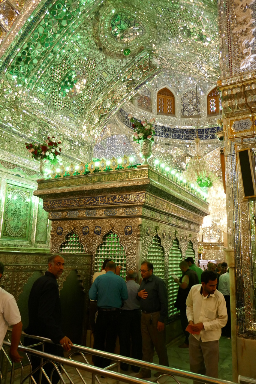 Dit na een tip van onze vriendelijke gids in het Shah-e-Cheragh, hij vertelde dat een neef van Ali-Ibn-e-Musa Al-Reza hier zijn tombe heeft en dat ik als vrouw die wel mag bezoeken. Het is een kleinere variant van het “spiegelpaleis” en gehuld in een chador mag ik hier dus wel naar binnen. Wat grootte betreft is het inderdaad kleiner, maar wat schoonheid betreft is het zeker niet minder. Duizenden spiegeltje komen je tegemoet en het houtwerk van de deuren is prachtig! Natuurlijk is er hier ook een aparte mannen- en vrouweningang. Een bezoek aan een moskee blijft een aparte ervaring. Zelfs hier in deze heilige schrijn doen de mensen hun dagelijkse dutje of appen op hun telefoon. Sterker nog: in het vrouwengedeelte zie ik zelfs een vrouw met pannetjes en potjes een kippepootje eten terwijl er tegenover een vrouw onder haar chador op haar knieën jammerend gebeden op zegt. Elders ligt een baby in een eenzame hoek ligt slapen. Haar moeder? een stuk verder in een andere hoek slaapt ook. Wonderlijk.