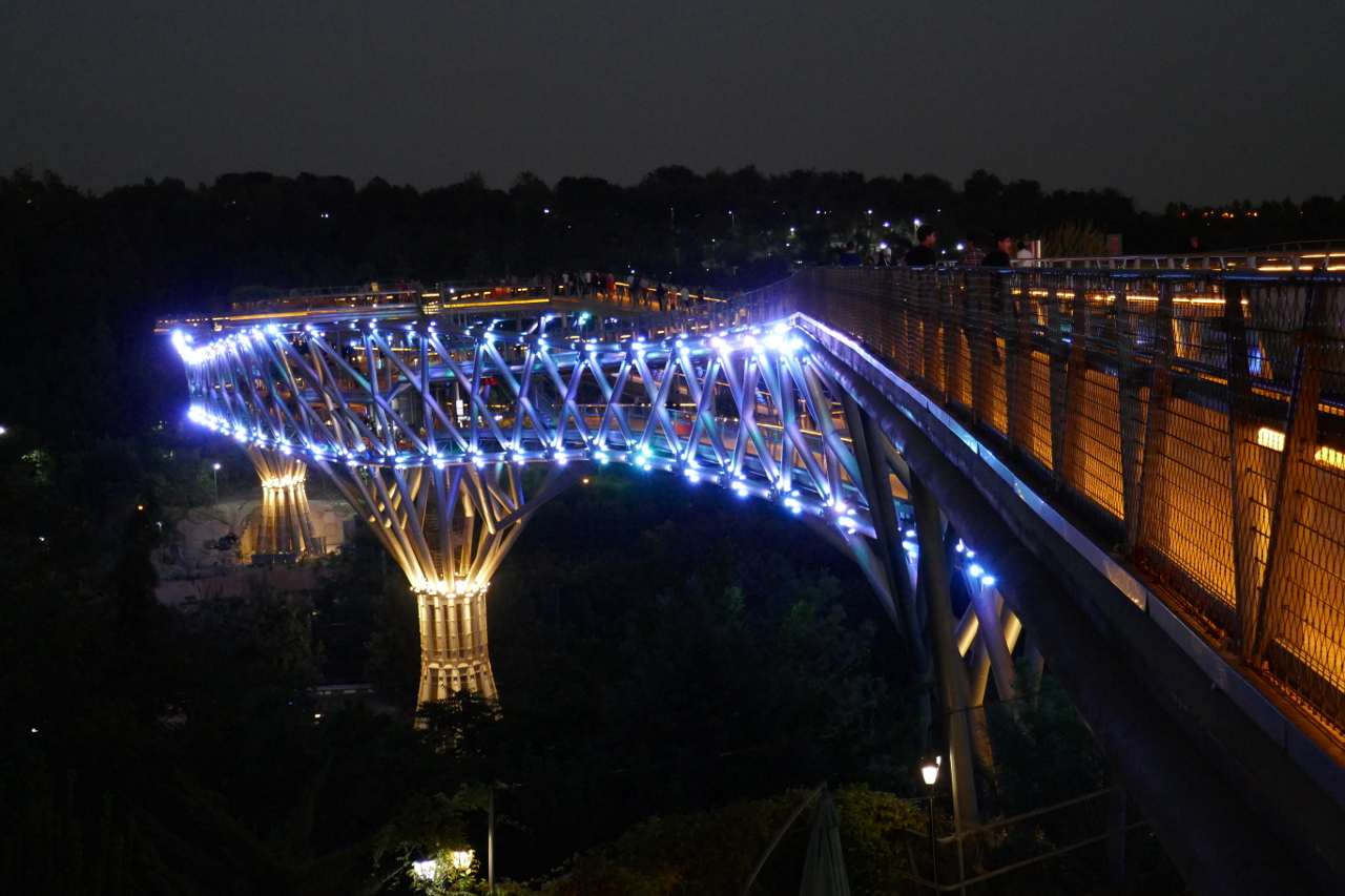 We lopen terug naar Darakeh en pakken een busje terug naar het busstation. We stappen in de metro en stappen halverwege uit bij Shahid Haqhani. Hier lopen we via het Taleghani Park naar de Tabiat brug. “Tabiat” betekent natuur in Farsi. Deze 270 meter lange brug is 3 jaar geleden geopend en ontworpen door de destijds 26-jarige Iraanse architecte Leila Araghian en heeft enkele internationale architectuur prijzen gewonnen. De Tabiat brug is een prachtig mooie gracieuze voetgangersbrug die het Taleghani Park en het Ab-o-Atash Park met elkaar verbindt door de drukke Modares snelweg te overspannen. We lopen over de brug heen en genieten van het uitzicht. Als we naar het noorden kijken zien we de bergen waar we vanochtend en in het begin van de middag gelopen hebben achter de skyline liggen. De brug bestaat uit twee verdiepingen en waar de bovenverdieping een soort promenade is, is de benedenverdieping gevuld met koffie-huizen en restaurants. Nadat we bij één van de restaurants iets hebben gegeten is het donker geworden. De brug is inmiddels sfeervol blauw en geel verlicht. We slenteren op ons gemak over de brug terug naar de metro. Het was weer een mooie relaxte dag waar we toch de rust hebben kunnen vinden in deze drukke metropool. Nu is het tijd om onze spulletjes in het koffer te pakken voor onze terugvlucht naar huis…
