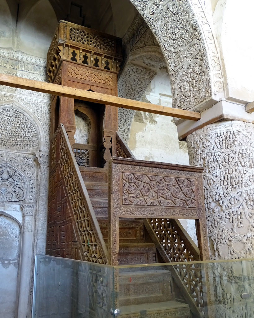 De moskee is bekend om zijn mihrab (gebedsnis) uit de veertiende eeuw. Naast de meghrab staat een preekstoel, een menbar, 700 jaar oud, uitgevoerd in fijn houtsnijwerk met bloemen- en geometrische motieven. Op de grote binnenplaats liggen vier albasten tegels. Deze zorgen ervoor dat er ondergronds nog daglicht kan komen. Als we de trap af gaan komen we in onderaardse gangetjes en ruimten van de vroegere vuurtempel. De moslims gebruikten de kelders onder de moskee als gebedsplaats gedurende de hete zomer Veel voormalige vuurtempels zijn verdwenen doordat de moslims er hun moskeeën bovenop bouwden.