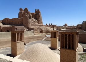 In afwachting van onze picknicklunch lopen we de inmiddels grotendeels verlaten oude stad in, die is opgetrokken uit leem. Er zijn veel geruïneerde gebouwen, waarvan de bewoners nu voor onderhoudsvriendelijker behuizing gekozen hebben, het geeft de indruk in de middeleeuwen beland te zijn. Centraal ligt het fort Narin Ghal’eh, een Sassanidisch fort dat de oase moest beschermen tegen invallen. Net daarvoor zien we een ab anbar, een drinkwaterreservoir, met 4 badgirs, de windtorens die voor koeling moeten zorgen. Het fort is grotendeels vergaan, maar is toch indrukwekkend om te zien.