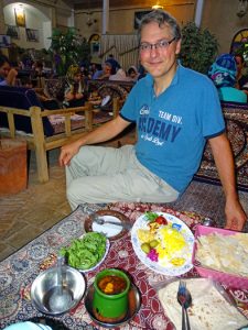 We besluiten om in het Abassi theehuis, ook gevestigd in een traditioneel koopmanshuis, te lunchen. Iraniers zijn gewend de maaltijd zittend op een tapijt te gebruiken. In traditionele restaurants staan dan ook grote zitplateau’s bedekt met tapijten waar hele families op passen. Ook wij krijgen zo’n bank toe gewezen. We bestellen een barbeque kip kebab met rijst en een dizi. Dit laatste traditionele gerecht dien je deels zelf te maken. Er wordt een smal hoog potje met schapenvlees, aardappel, spliterwten, kikkererwten en tomaten in kookvocht gebracht. Als eerste laat je het vocht in een kom uitlekken. Daarna haal je het vlees eruit en schep je twee eetlepels vocht terug in het pannetje. Nu stamp je alles met de bijgeleverde stamper in het potje fijn. Als laatste doe je het schapenvlees terug en stamp je nog een keer. Je schept nu alles eruit en verdeelt alles gelijkmatig over een bord. Tijdens dit alles zorg je ervoor dat je stukjes papadums met sesamzaad in de kom met vocht laat weken. Je dizi is klaar, samen met wat (naan)brood eet je het gerecht op. Erg lekker!