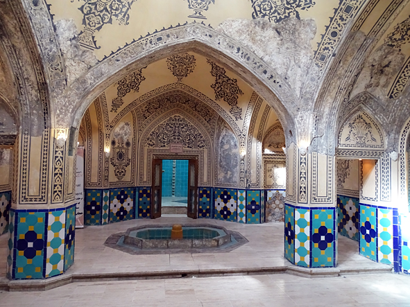 Na de lunch ligt even verderop de Sultan Amir Ahmad hamam, gebouwd in de 16de eeuw tijdens het bewind van de Safawiden. Dit grote (1000 m2) traditionele badhuis is versierd met turkoois en goud tegelwerk, prachtig om te zien! Op elke pilaar van het centrale badhuis zie je kleine naive muurschilderingen als zijnde kleine schilderijtjes. Op het dak de koepels met kleine ronde albasten ruitjes. Vandaar kun je niet naar binnen kijken maar binnen leveren ze veel licht en sfeer en kun je wel naar buiten kijken.