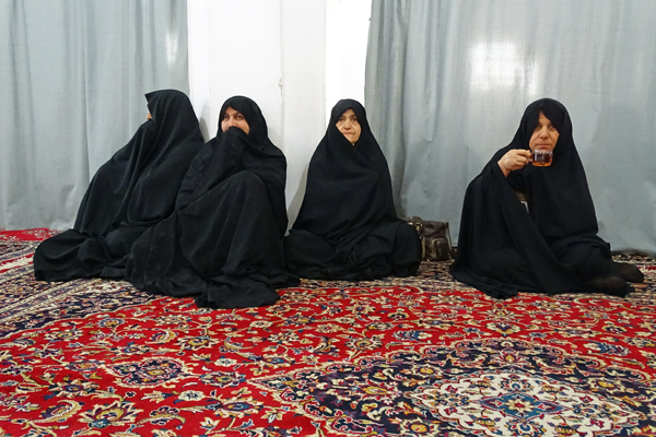 We lopen richting de gebedsruimtes en worden meteen heel vriendelijk begroet en met gebaren gevraagd om naar binnen te komen. Jacqueline natuurlijk bij het vrouwengedeelte en ik bij de mannen. Het geheel is alleen gescheiden door een paar lakens. Het geluid van gebeden schalmt over de speakers. Jacqueline krijgt meteen een kop thee aangeboden en een vrouw geeft haar snoepjes. Het oogt veel gezelliger dan onze gebedsdiensten. De vrouwen keuvelen wat met elkaar, drinken thee en zo nu en dan prevelen ze mee met de gebeden. Ze willen erg graag contact en vragen, wijzend op mijn camera zelfs of ze op de foto mogen. Jammer genoeg doen ze wel eerst hun chador, die tot dan toe losjes open hing, tot aan hun kin dicht. Een man brengt bekertjes met verse citroen limonade rond. Heerlijk!