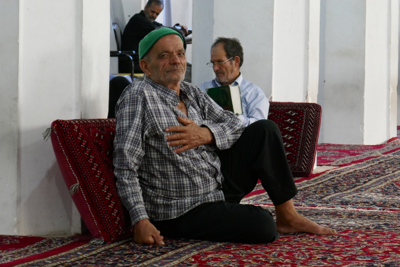 Bij mij is het niet anders, ook ik krijg een verse limonade en een koek. De mannen knikken of wuiven vriendelijk. Sommige praten zachtjes met elkaar, andere lezen uit een dikke Koran, soms ondersteund door een houten standaard, weer andere bidden met een rozenkrans. Er heerst een serene rust. Ik vraag aan een man die halfliggend tegen een pilaar rust of ik een foto mag maken. Hij knikt instemmend en haalt een petje tevoorschijn en zet deze op. Met zijn rechterhand op zijn hart kijkt hij me aan. Prachtig! De vriendelijkheid is hartverwarmend en steekt in een schril contrast af met hoe over moslims wordt gedacht, stereotypen voornamelijk veroorzaakt door een stel idioten en testosteron jongeren, in de westerse wereld.