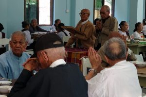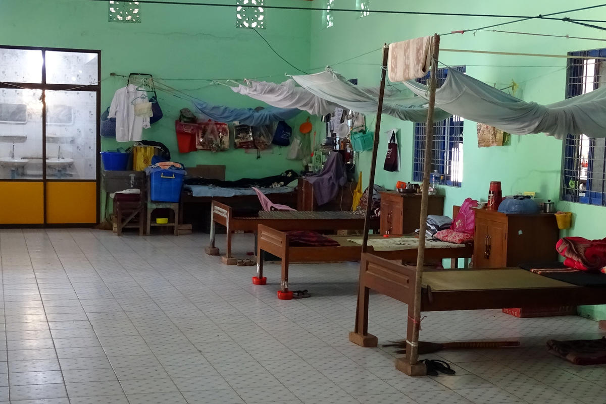 We bezoeken ook de “Buddhist Home for the Aged People”, een bejaardentehuis voor oudere mensen die geen familie meer hebben. Normaal worden de ouderen in Myanmar door hun familie verzorgd en dit huis werd in 1915 opgericht en was toen uniek voor Myanmar. Het huis is gesticht door een vrouw die in korte tijd beide ouders verloor en zag hoe oudjes zonder familie in erbarmelijke toestand leefden. Zij heeft toen besloten om haar volledige erfenis te gebruiken om dit tehuis op te richten. Inmiddels zijn er elf tehuizen van deze stichting. Het tehuis is hoofdzakelijk afhankelijk van donaties en de regering ondersteund het tehuis alleen met wat rijst. Er is één zuster die meer dan 80 bejaarden verzorgd. We komen tijdens etenstijd en alle bejaarden zitten in de grote eetzaal en bidden voordat ze aan de maaltijd beginnen.