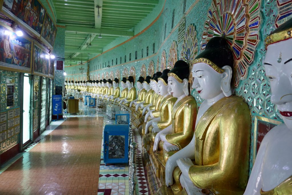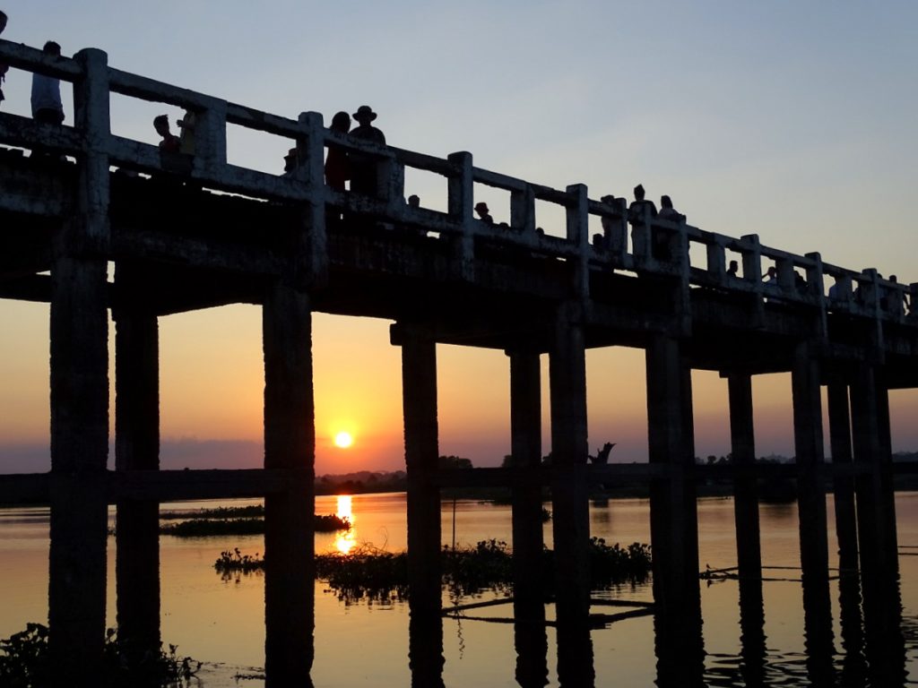 Amarapura, ten zuiden van Mandalay, was maar voor twee korte periodes tijdens de 18de en 19de eeuw een koningsstad en staat vooral bekend om de U Bein brug, gebouwd rond 1850 en waarschijnlijk de oudste en toen langste (1200 meter) teakhouten brug van de wereld over het Thaungtaman meer. De lokale bevolking maakt veel gebruik van de brug, maar rond zonsondergang wordt de brug overgenomen door de honderden Burmese en buitenlandse toeristen om een foto te maken van de brug bij zonsondergang. Voetje voor voetje schuifelen we over de brug, telkens weer wachtend op alle selfie makende dames en heren die schijnbaar aan één foto niet genoeg hebben, maar er 30 in alle standjes moeten maken. Het doet me denken aan de aan selfie verslaafde Chinezen. Ik hoop niet dat ze hier in Myanmar die kant ook opgaan, want dan verliest dit land een groot deel van zijn charme…