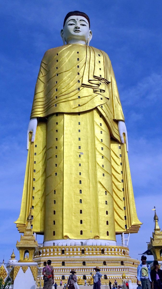 Nog ver voordat we Monywa bereiken zien we in de verte al de gigantische boeddha Laykyun Setkyar staan.
