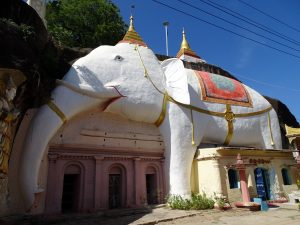 De Shwe Ba Hill lag hier ook in de buurt. Ook hier weer grotten en tempels die uitgehouwen zijn in de heuvel, maar dan van veel latere datum. Deze zijn zo’n 100 jaar oud. Via trappen loop je daar naar beneden tussen hele steile kliffen. De aan weerszijden uitgehouwen tempels zijn heel kleurrijk aan de buitenkant. Een ingang was zelfs in de vorm van een reuze olifant. Zelfs nu nog laten rijke birmezen hier nieuwe grotten uithouwen.