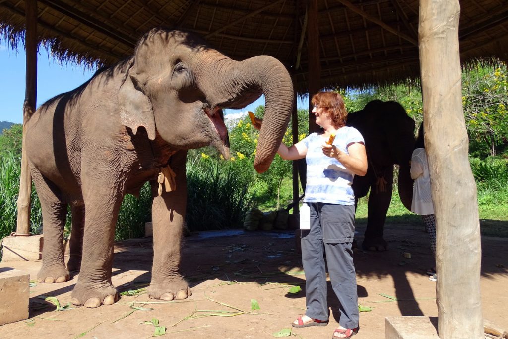 Het voeren had wel wat gebruiksaanwijzingen, de ene olifant was blind aan een oog en kon je dus beter via de kant van het goede oog benaderen, een andere olifant wilde de bananenboomstukken alleen via de mond gevoerd krijgen. Maar waar ze allen gelijk in waren was in hun voorkeur voor pompoen.