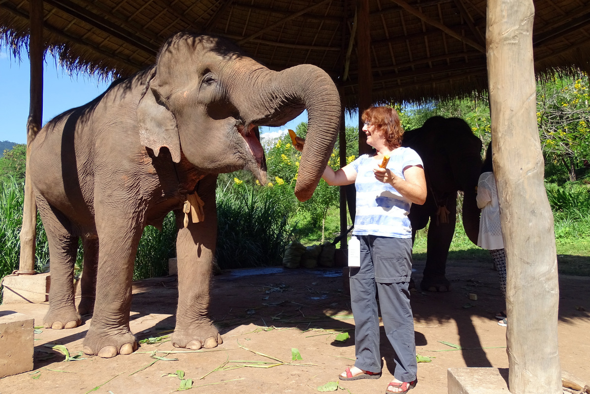 Olifanten eten minimaal 150 kilo voedsel per dag en als bezoeker mag je ze de hele dag voeren. Momenteel verblijven er acht olifanten in de leeftijd van 10 jaar tot 67 jaar. De 10-jarige is een verweesde olifant. Maar er was ook een olifant met een schotwond in de linkerschouder en andere verwondingen. Een duidelijk slachtoffer van een boze boer. Er stonden gigantische tonnen voedsel voor ons klaar met daarin pompoen, stukken van de bananenplant, bamboe en ter plekke gemaakte natte granenbollen.
