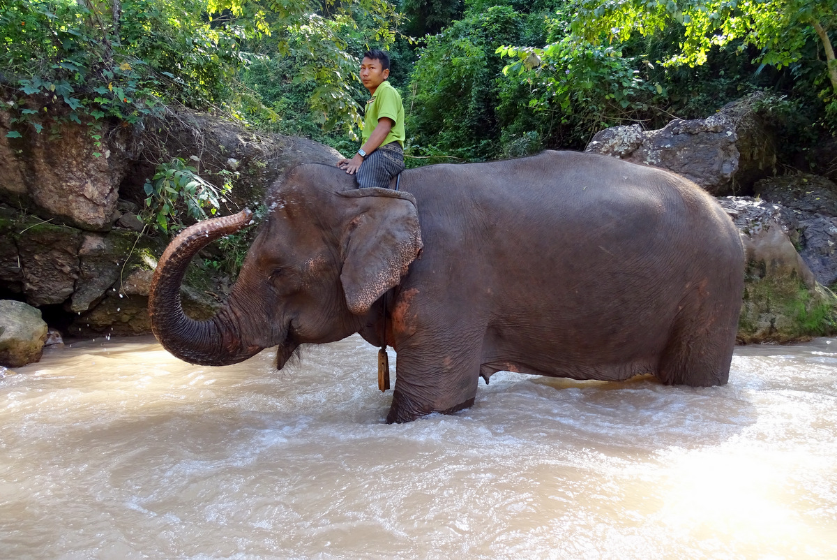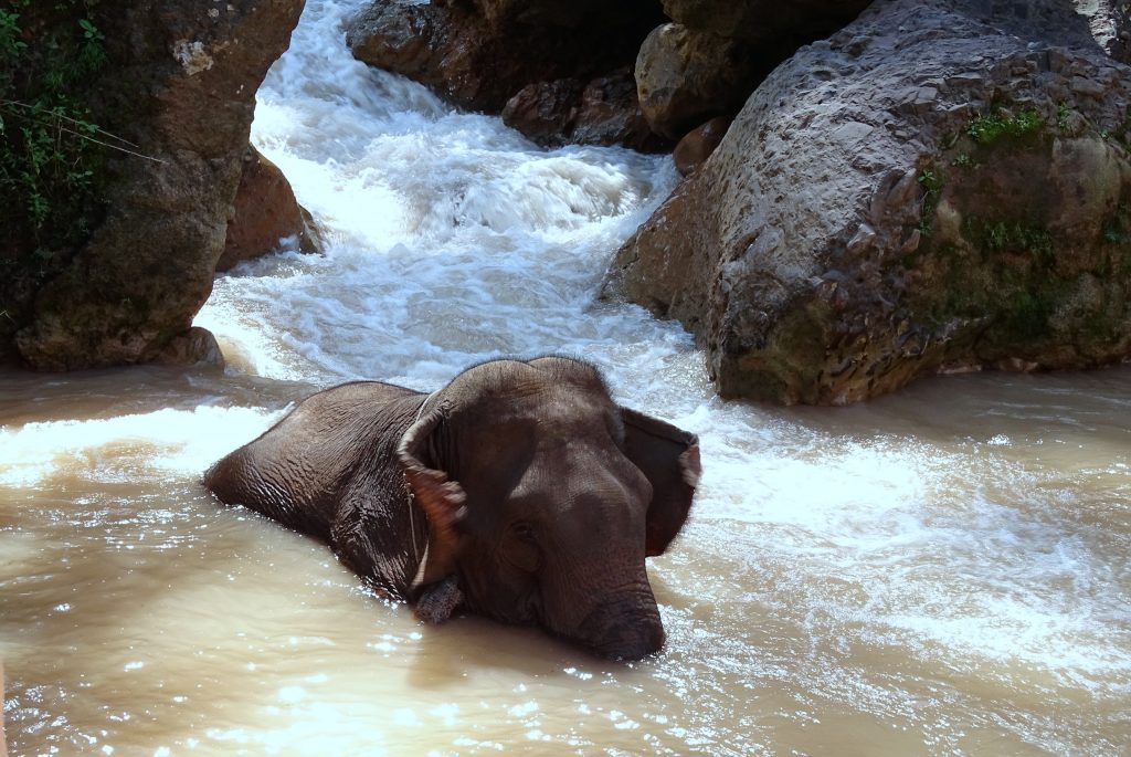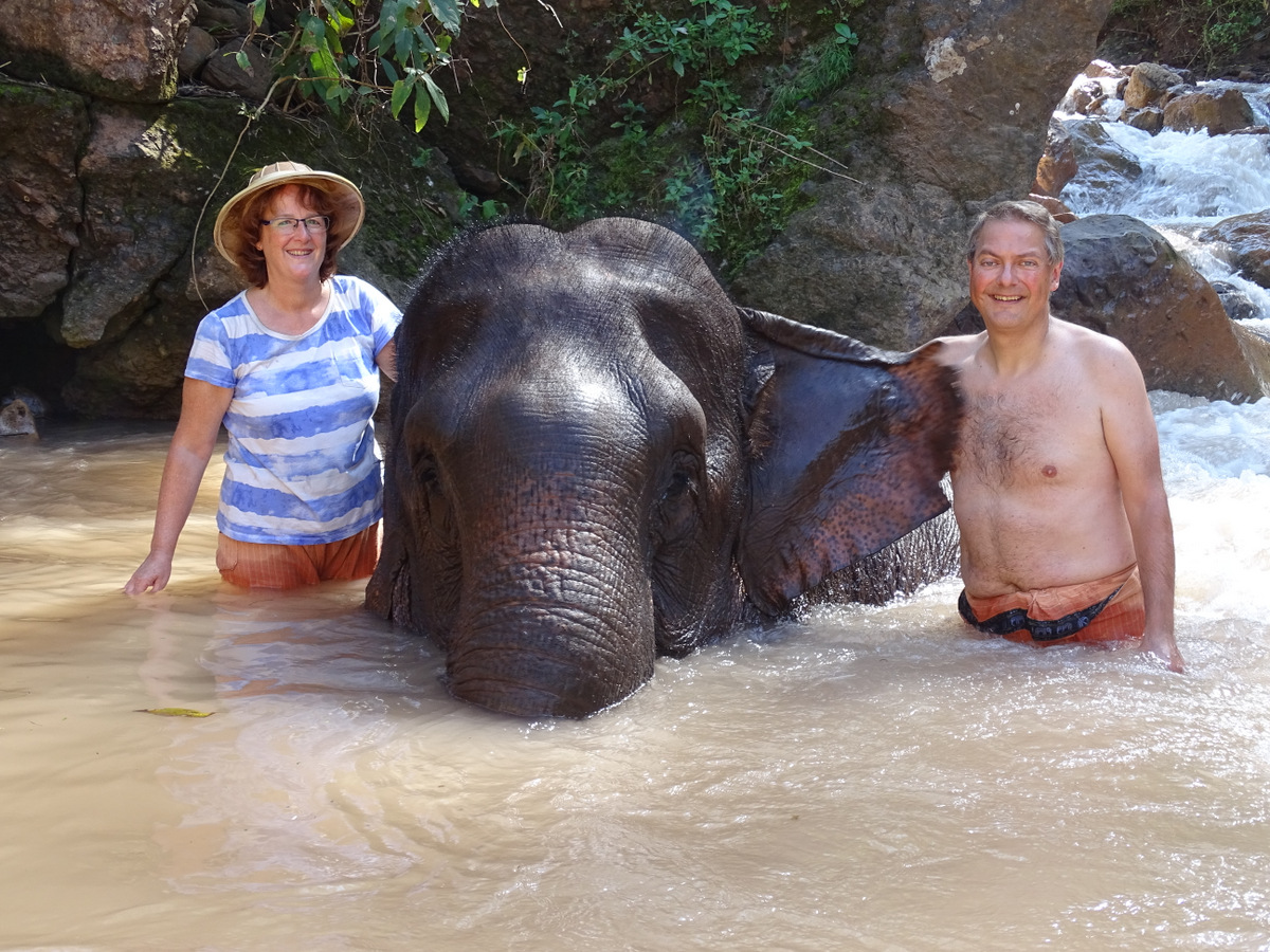 De olifant wordt door de verzorger naar een kleine waterval in de rivier gebracht en vervolgens kan het badderen beginnen. Wij kregen een dot ruw bastmateriaal en konden daarmee de olifant schrobben. En die vond het overduidelijk heerlijk. Ging zelfs een beetje mijn kant uithangen…