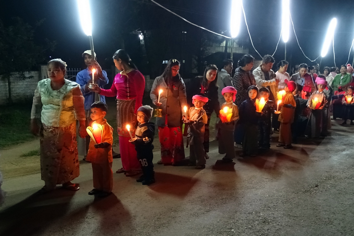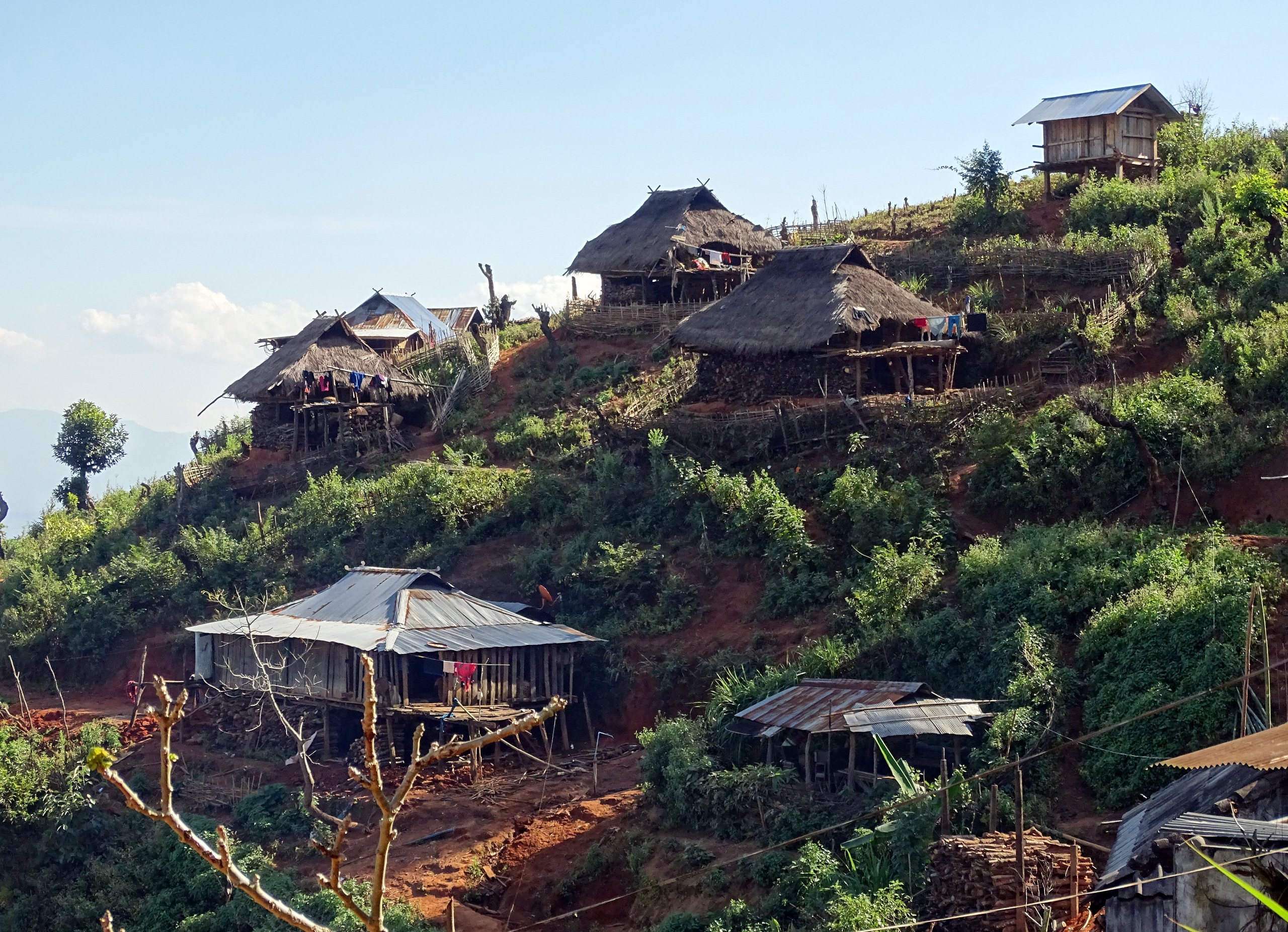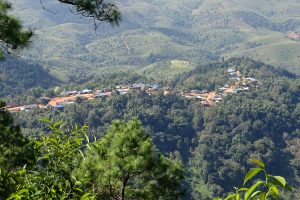 Hokyin dorp 1 is christelijk, Hokyin dorp 2 is animistisch, dorp 3 is weer christelijk en dorp 4 is in drie delen gescheiden. Die zijn ook duidelijk te zien. Wij komen bergopwaarts wandelend ook uit bij dorp 4. We komen aan op een open plateau met een boeddhistische pagode.