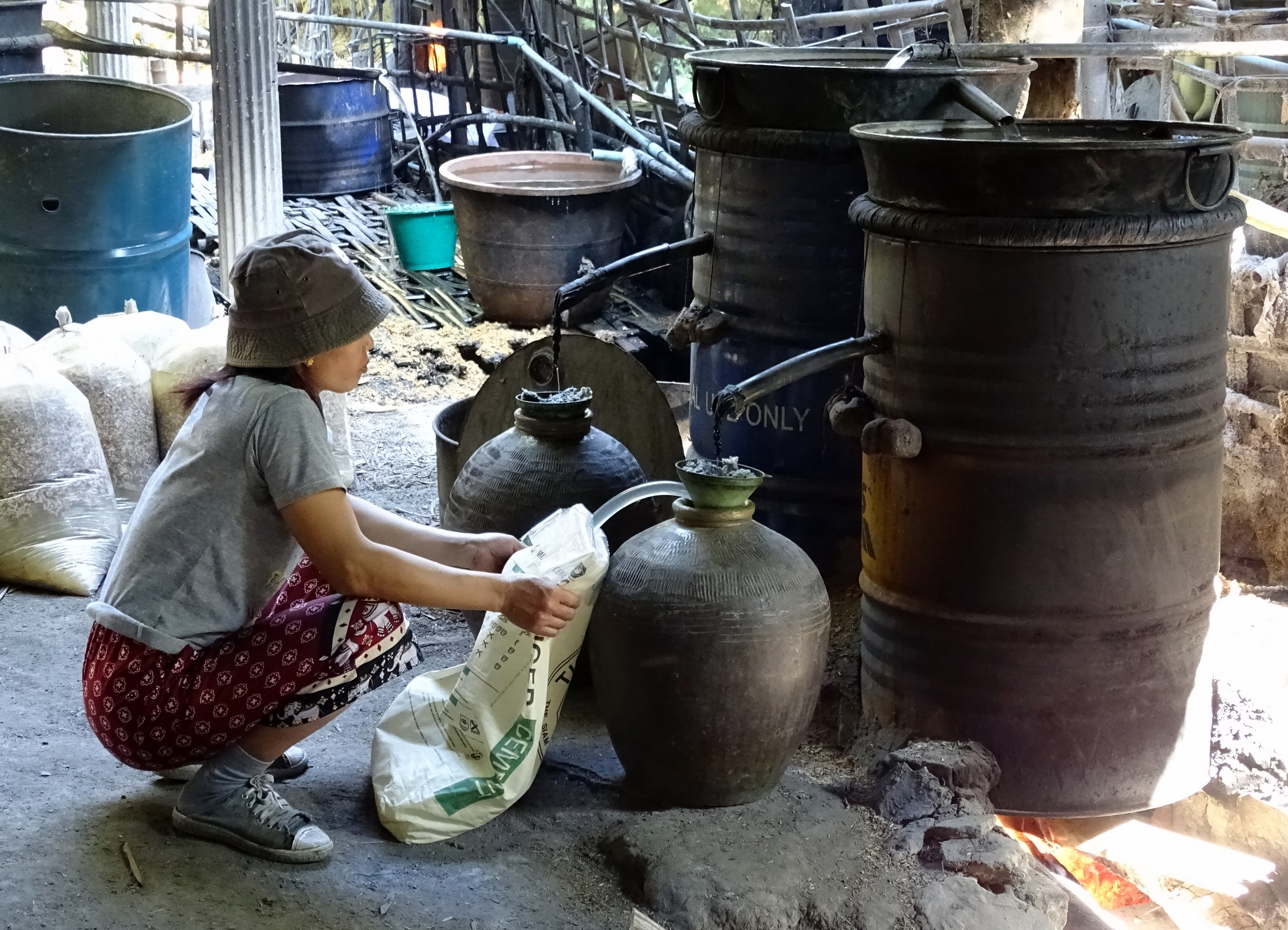 Deze wordt gemaakt van rijst. De rijst wordt met toevoeging van de vliesjes en gist in grote 30 kg zakken weg gezet om te fermenteren gedurende drie weken. Daarna wordt het gewonnen vocht gezeefd en met behulp van stoomketels tot de heldere meer dan 40 % alcohol bevattende saké gedestilleerd. Drie zakken gefermenteerd vocht levert 1 30 kg zak sake. De drank wordt grotendeels illegaal verhandeld aan Thailand en China.