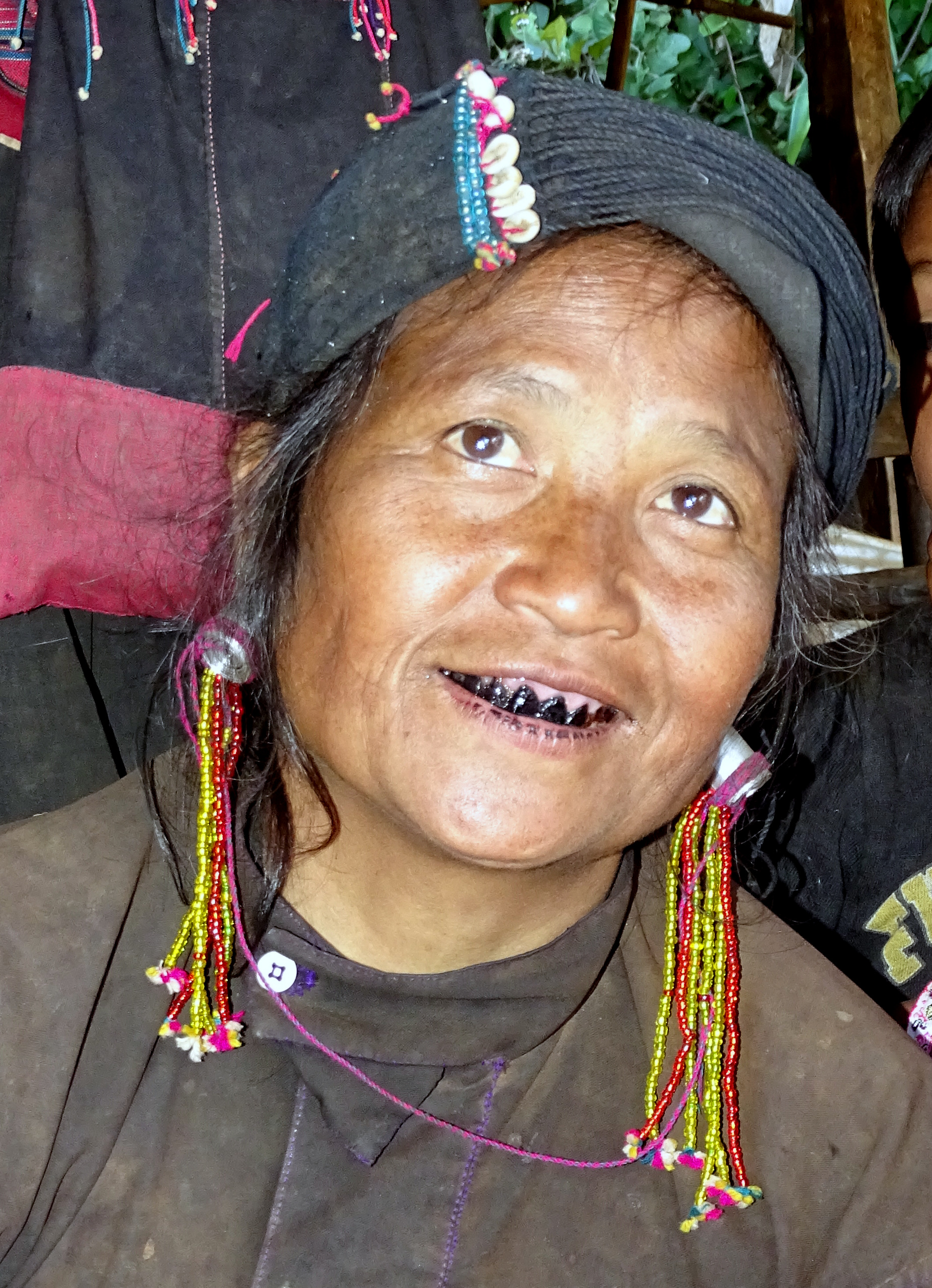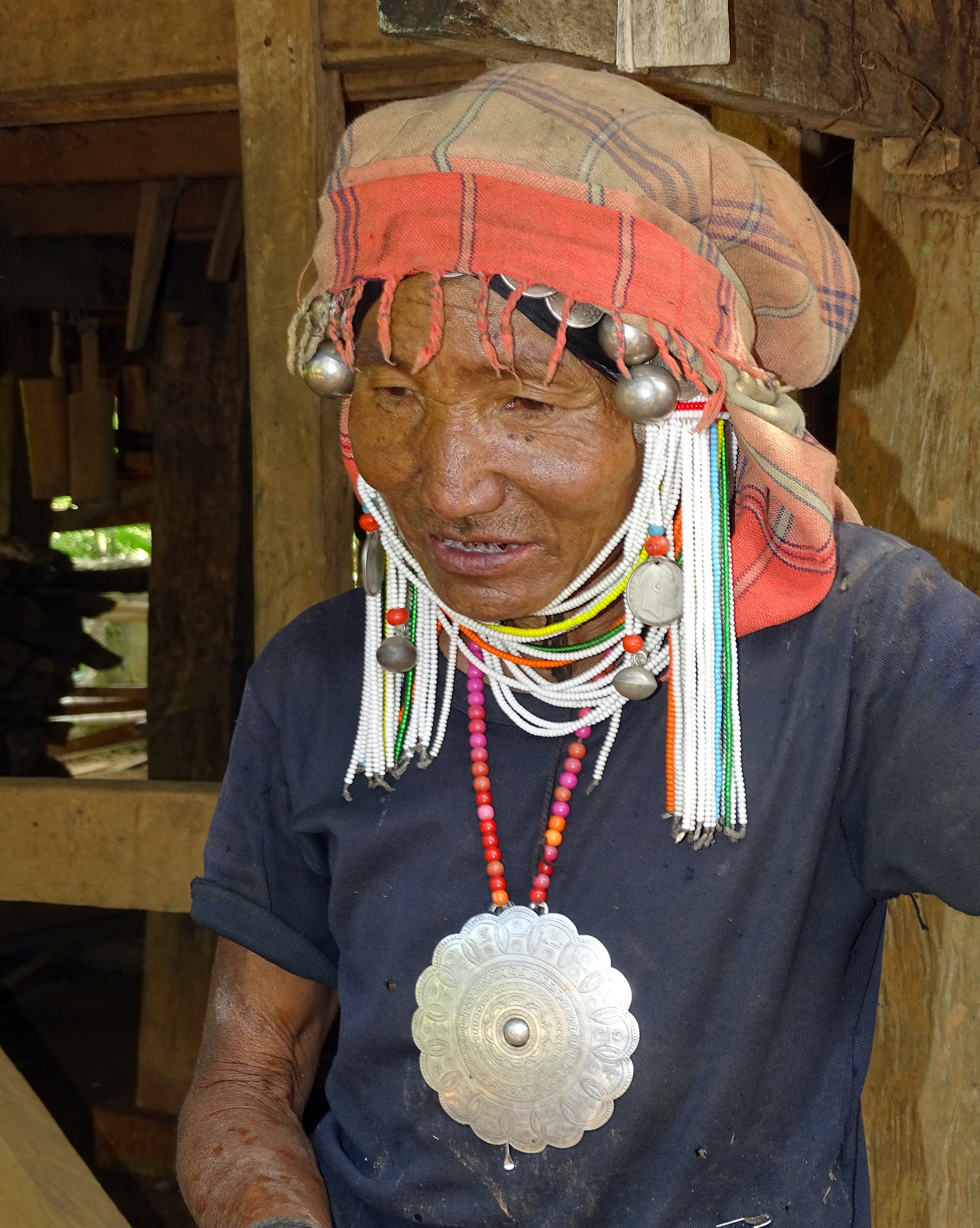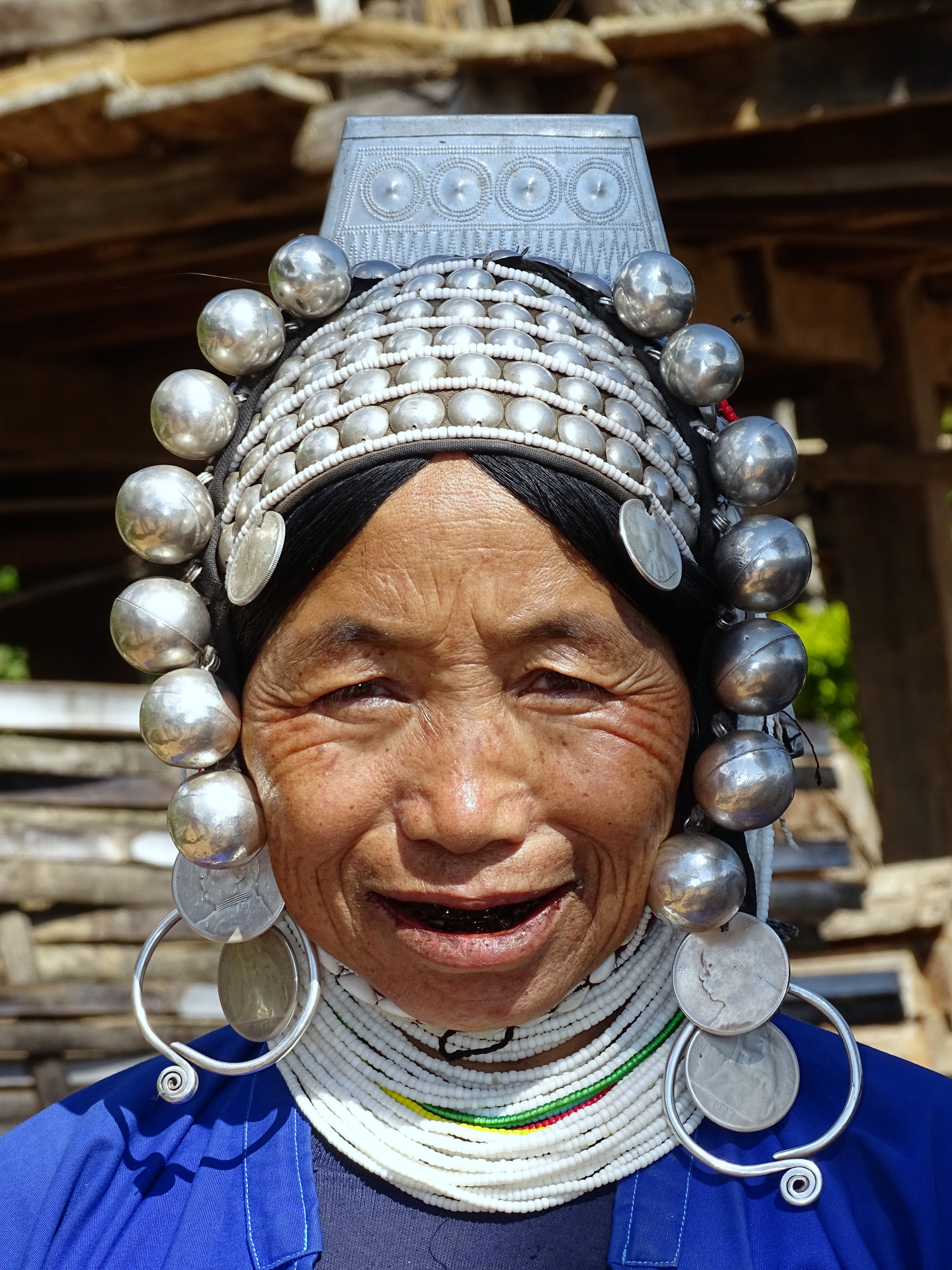 De Akha vind ik de mooiste groep wat traditionele dracht betreft. Zij dragen prachtige hoofddeksels die met zilveren bollen en zilveren munten en veel kralenkettingen zijn versierd. Ze zijn zwaar en kostbaar. Ik ontdekte in één van de haarversieringen Franse zilveren munten uit 1923 en oude zilveren Indiase roepie’s van nog oudere datum..