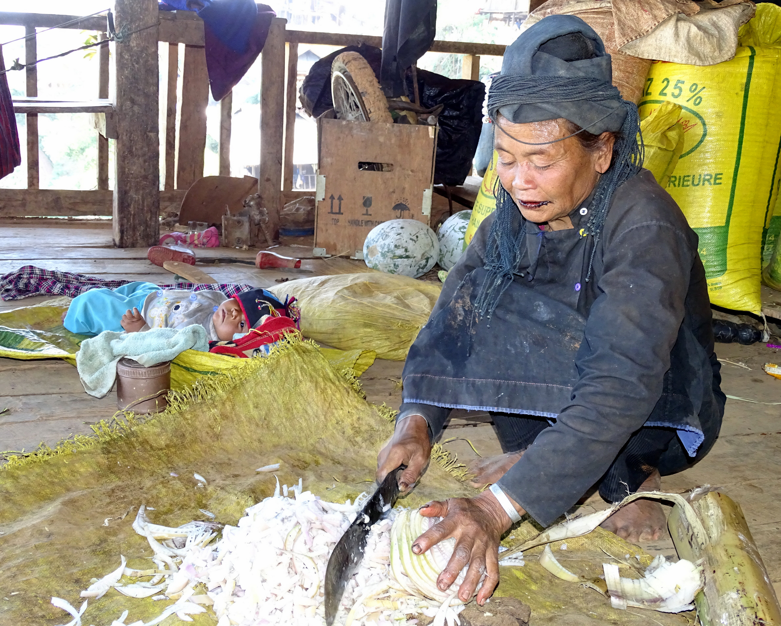 Wij bezochten één van de huizen. De 37 jarige bewoonster die ons heel lief voorzag van thee, aardappelen, banaan en pinda’s is getrouwd en heeft 11 kinderen zelf gebaard. Er was niemand om haar te helpen immers was zij verantwoordelijk voor het huishouden en werkt de rest van de familie op het veld. Ze was alleen toen ze haar kinderen baarde en heeft eigenhandig de navelstreng doorgeknipt. Vier van haar kinderen zijn bij de geboorte of kort daarna gestorven dus nu heeft ze er nog zeven.