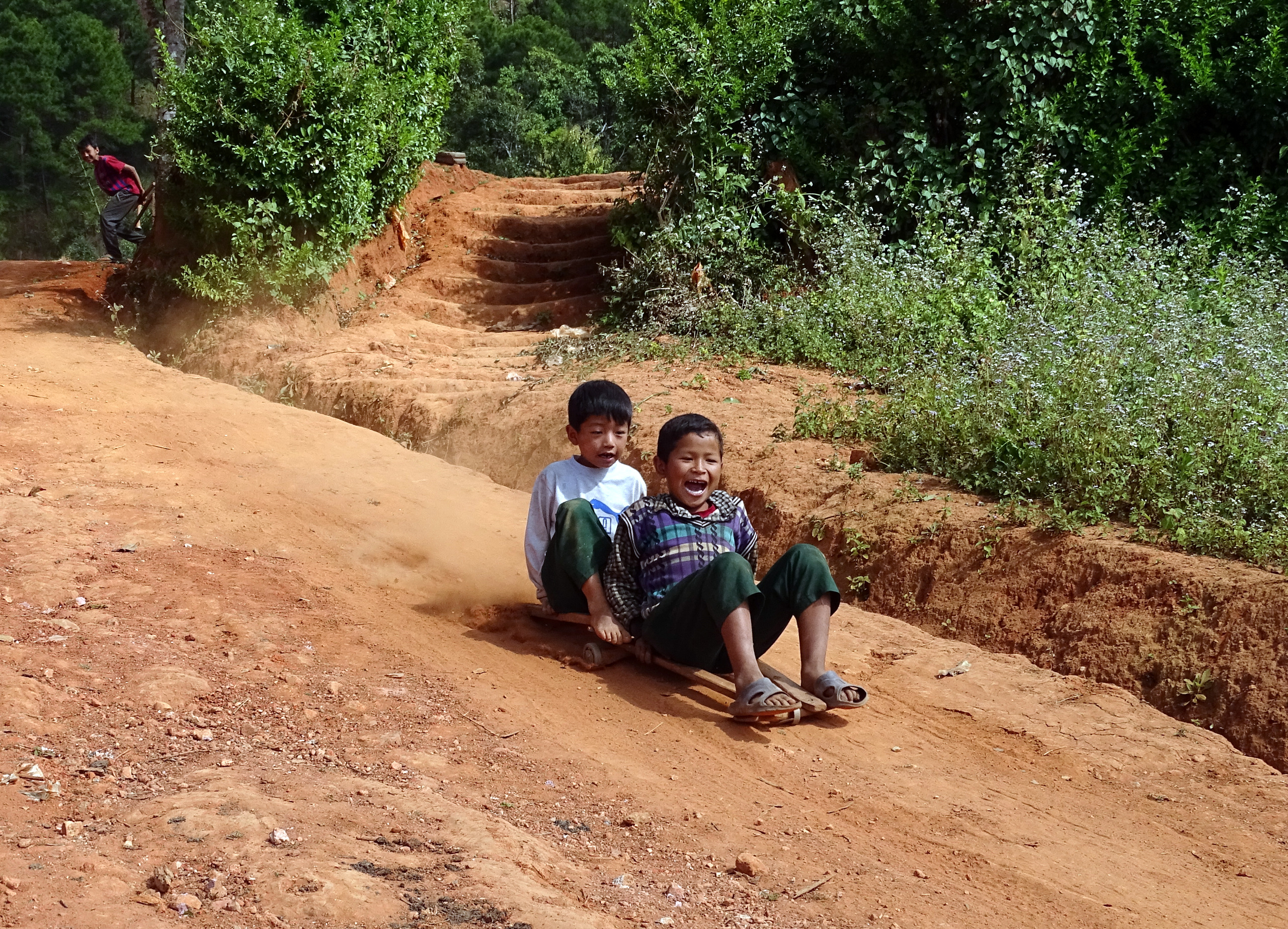 Het is zondag dus de kinderen hoefden niet naar school. Al meteen aan het begin stuiten we op een groepje jongens die de grootste lol hadden met hun versie van een slee, op twee wieltjes wel te verstaan. Ze sjeesden ermee van de heuvel af over de keiharde grillige ondergrond en kwamen beneden aan bij een soort schans. De ene draaide net ervoor af een erf op, anderen namen de sprong de diepte in om vervolgens breed lachend weer met hun slee de berg op te lopen.