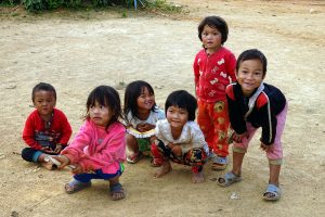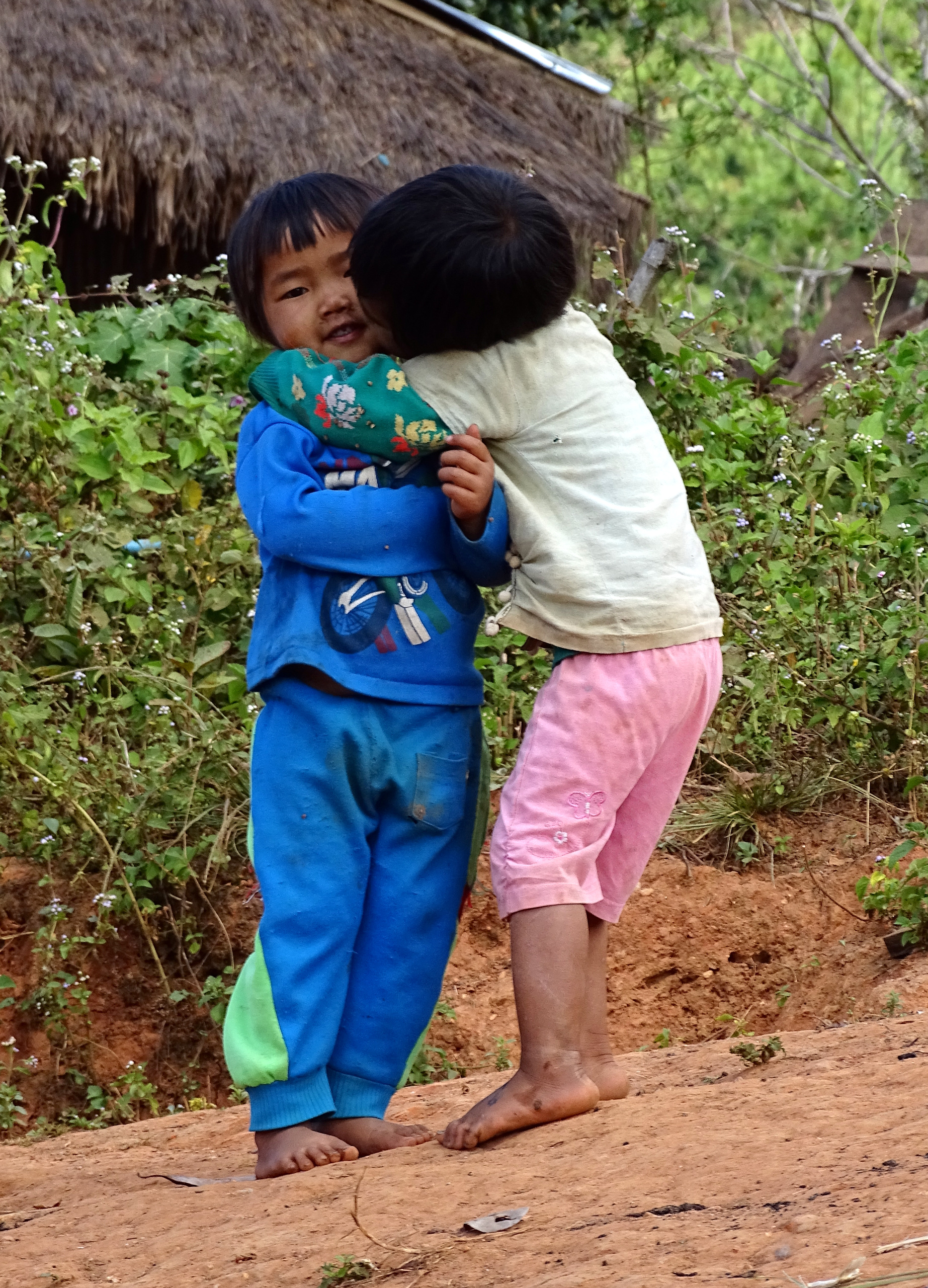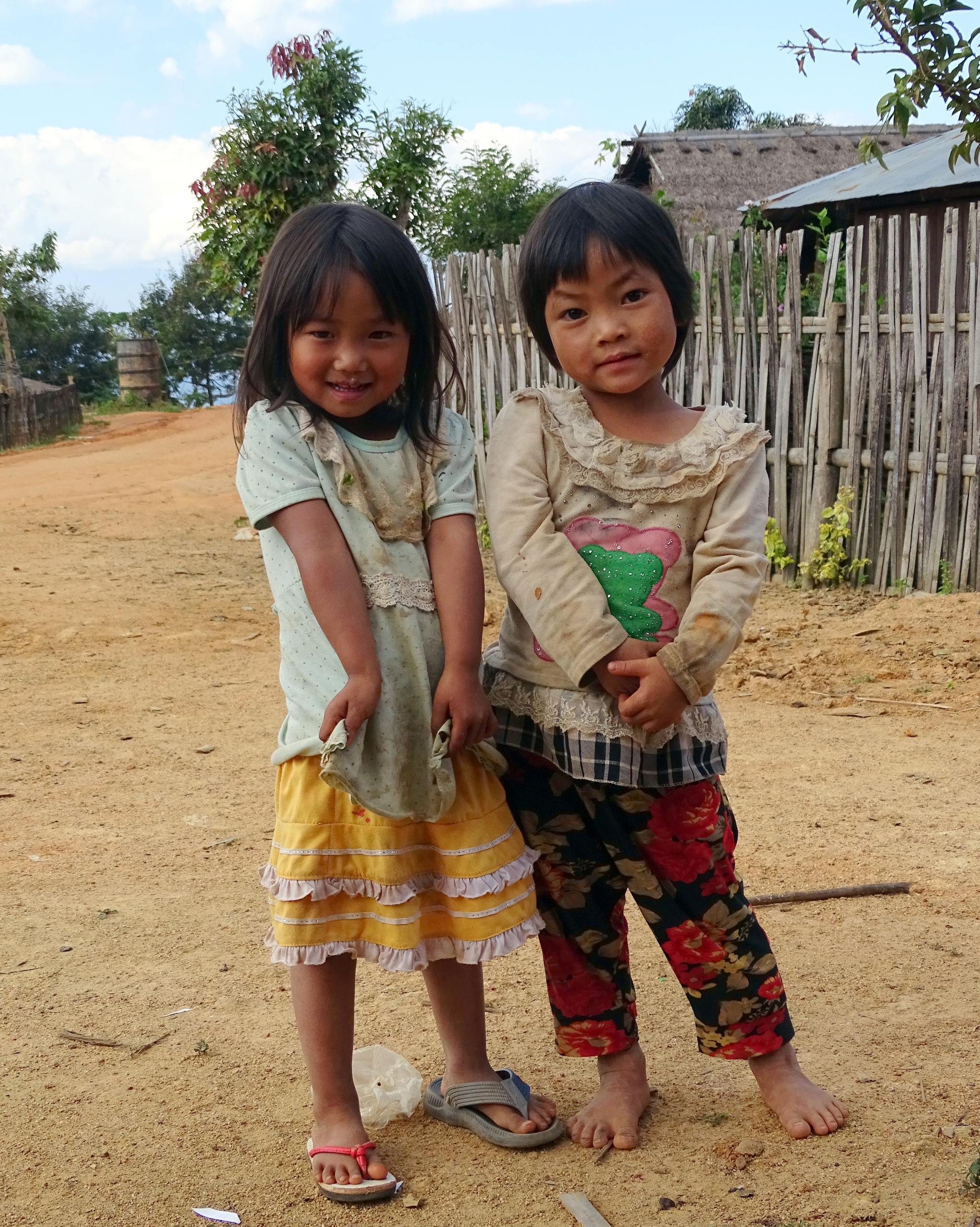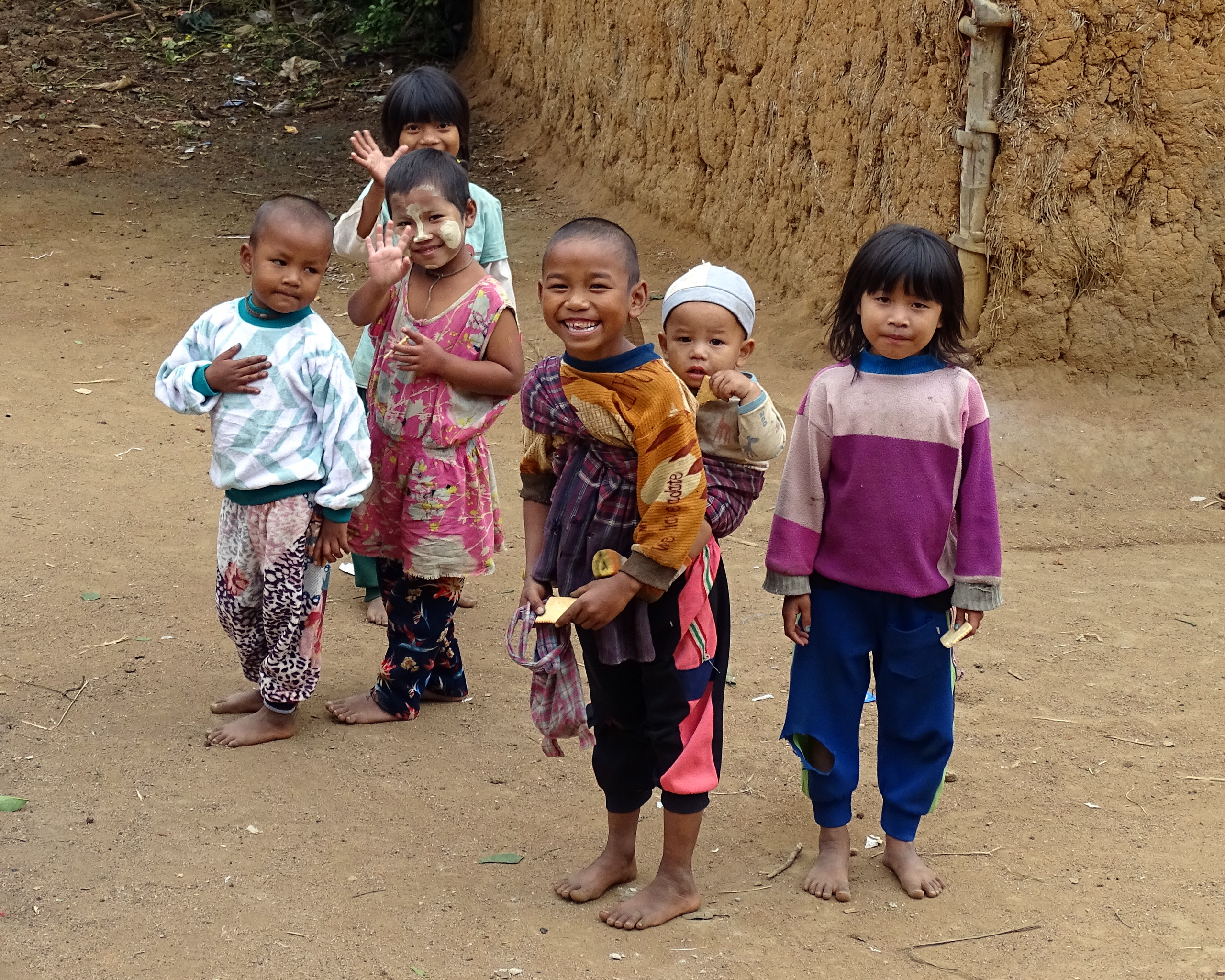 In Hokyin 3, een christelijk dorp hebben we op de veranda van een huis onze meegebrachte lunch genuttigd. Dat zorgde voor grote hilariteit bij de plaatselijke jeugd. Grote nieuwsgierigheid, verlegen gelach en ondeugende kiekeboe spelletjes. Lachen. En terughoudendheid en verlegenheid als ze allemaal een biscuitje mochten komen halen.