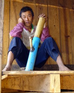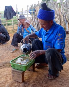 De Akha’s waren oorspronkelijk animistisch en deden ook aan voorouderverering. Het dorp dat wij nu bezochten is echter tot het protestante geloof bekeerd. Echter houden ze er toch wel oude traditionele gebruiken op na.