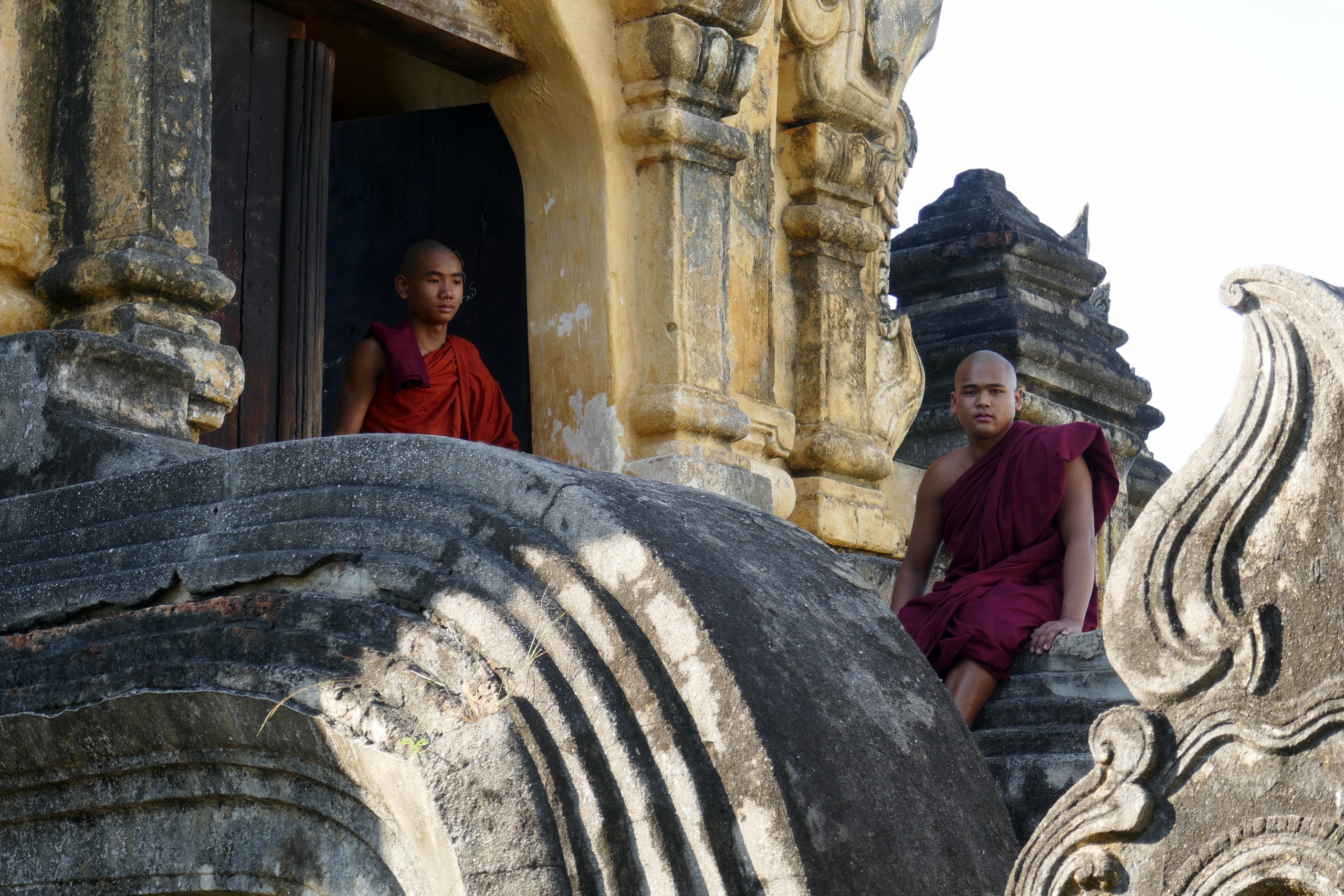 Bonus twee: een lieve Birmese dame die vond dat ik er vooral even bij moest gaan zitten na de klim van deze hoge trap. Ik liep er natuurlijk weer bij met vuurrood bezweet hoofd. Met wat Birmese woorden en gebaren hadden we een gezellig contact en vond ze het ook prima om op de foto te gaan. Grote hilariteit toen ze de foto zag en ik met adjen laddeh aangaf hoe mooi ik haar vond met de geknoopte doek op haar hoofd.