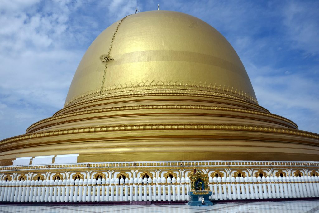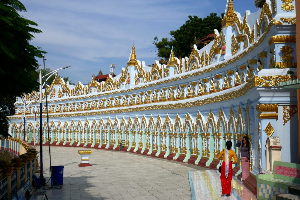 Verderop zien we wel een voltooide pagode, prachtig wit met ronde vormen, de Hsinbyume pagoda.