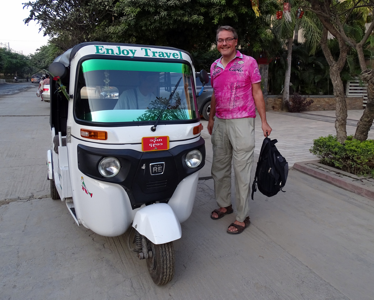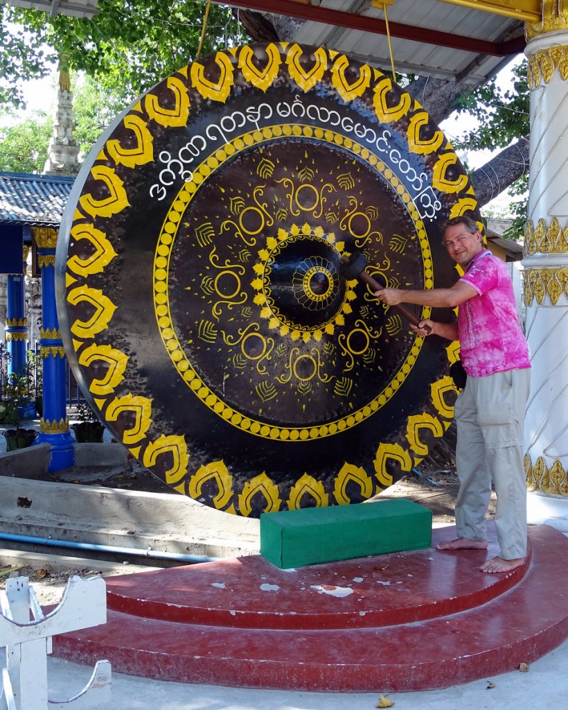Een Toto, de lokale naam voor een Tuktuk, brengt ons naar de Kyauk Taw Gyi pagode. Op het terrein van de pagode staan enkele grote gongs en klokken, waar iedereen naar hartenlust op slaat. Wat opvalt is dat net als in de moskeeën in Iran hier iedereen zijn gang kan gaan: telefoneren met je mobiel, foto’s maken, je middagmaal nuttigen. En de monniken doen er net zo hard aan mee.