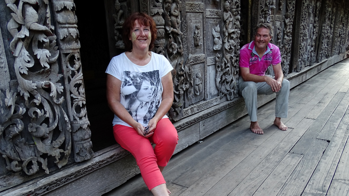 Het Shwenandaw klooster uit 1880 is volledig gebouwd uit bewerkt teakhout. Het gebouw deed dienst als woning van koning Mindon, maar zijn zoon verplaatste het later naar een ander deel van Mandalay. Doordat in de tweede wereldoorlog het hele koninklijke paleis is plat gebombardeerd is dit het enig overgebleven origineel gebouw van het paleis. De deuren en muren zien er prachtig uit. Achter het klooster zien we enkele mensen bezig met het schoonmaken of restaureren van de houten panelen.