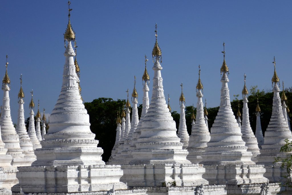 Verderop zien we wel een voltooide pagode, prachtig wit met ronde vormen, de Hsinbyume pagoda.