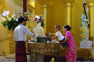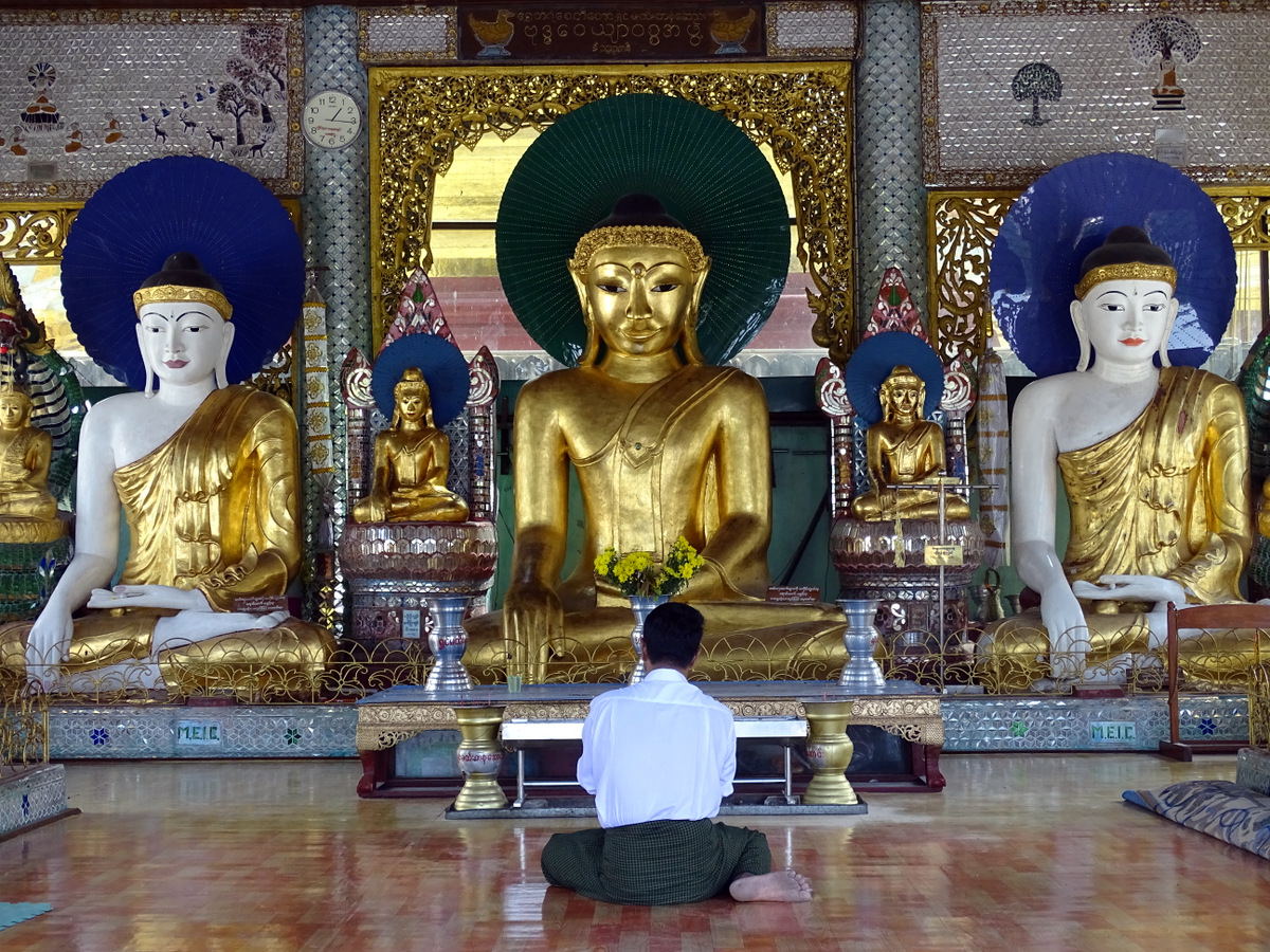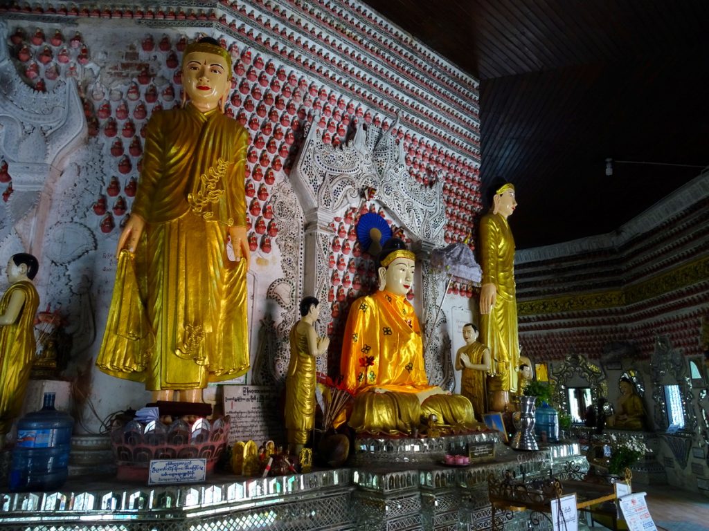 Het leuke aan Myanmar is, dat het land bezaait is met tempels en pagodes. Je kunt bijna geen weg inslaan of je ziet er wel eentje staan. Zo kwamen we onderweg naar de Shwedagon tempel voorbij aan de mooie Sein Yaung Chi pagoda,die zowel binnen als buiten uitzag als een spiegeltjespaleis. Binnen in de meerkantige pagode stonden enkele grotere staande en zittende marmeren met bladgoud vergulde boeddha’s omringd door honderden kleine rode boeddha beelden.