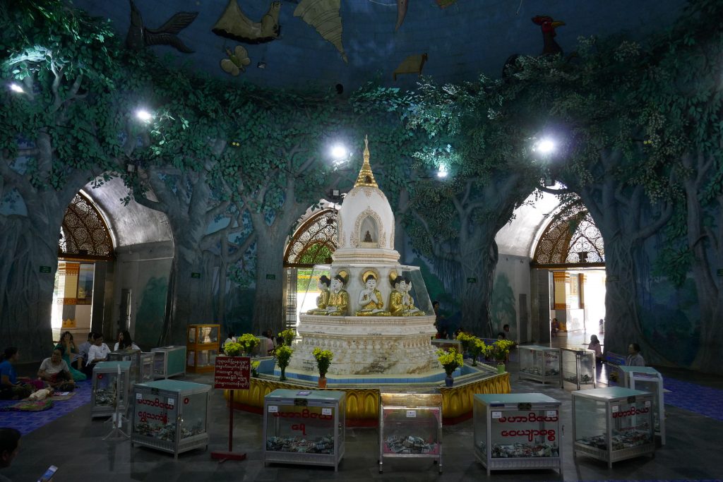 Ook verderop zien we weer een heel andere tempel, de Maha Wizaya pagoda, met in zijn ronde binnenkant een natuurlijk tafereel met aan het plafond een blauwe hemel met daarop dierenfiguren en sterrebeelden geschilderd.